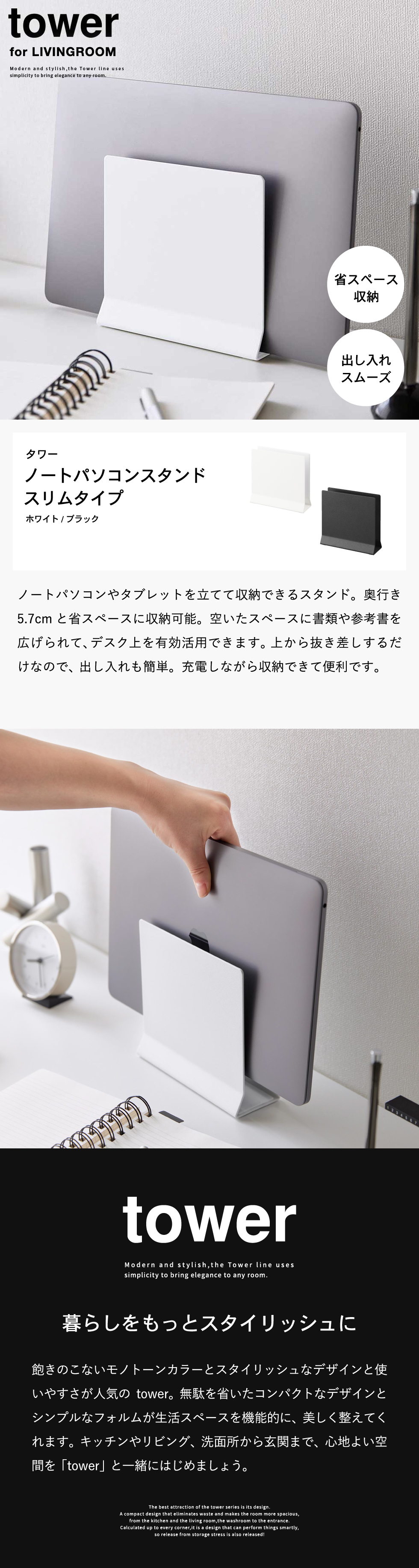 山崎実業 tower スリムノートパソコンスタンド タワー ホワイト ブラック 4498 4499