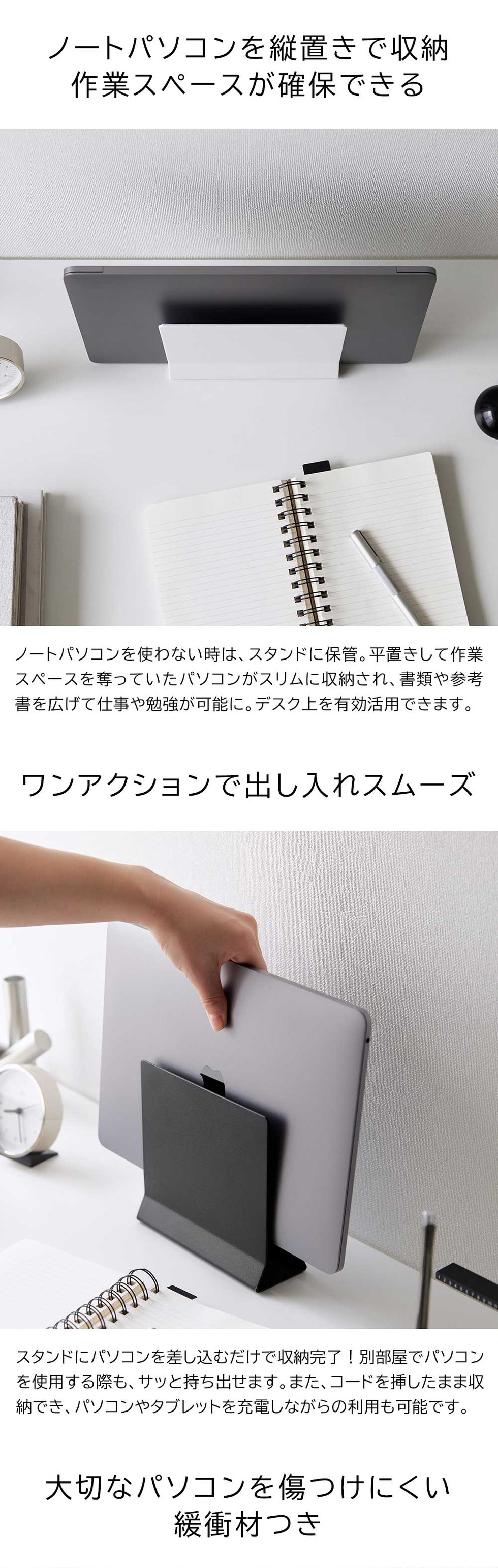 ノートPCやタブレットを縦置き収納できるスタンド。PCがスリムに収納でき、ワークスペースが広がる。在宅ワークやリビング学習、学習デスクに最適。PCを傷つけにくい緩衝材つき。