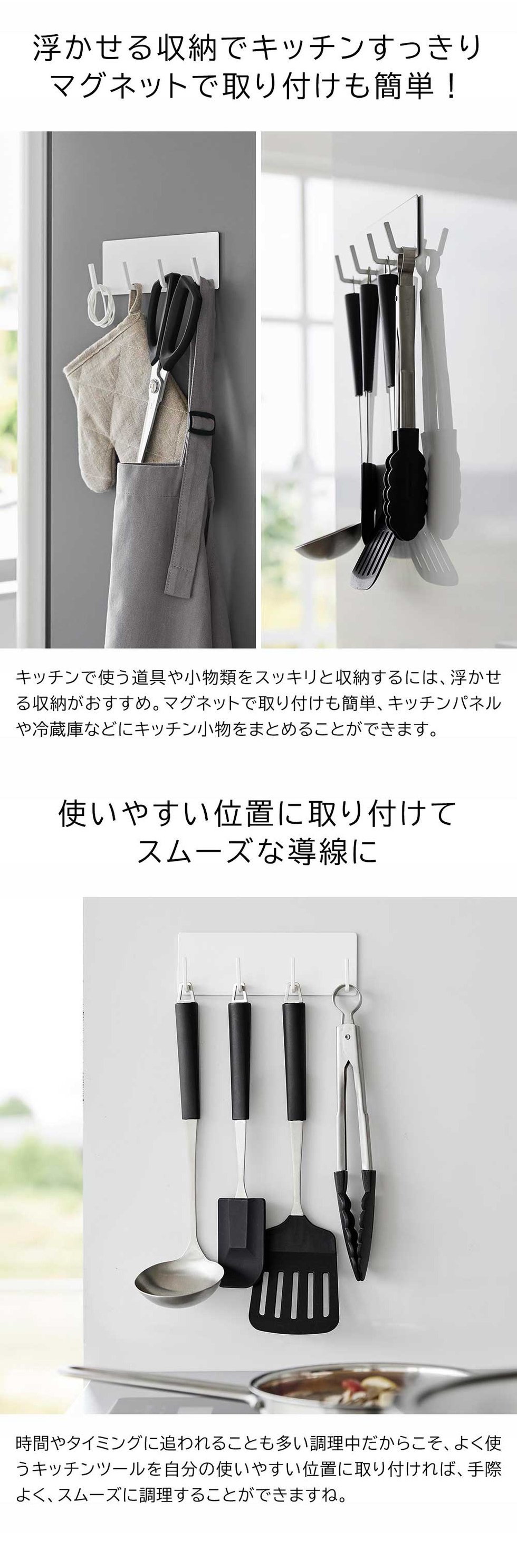 マグネットでキッチンパネルや冷蔵庫横に簡単に取り付けできるキッチンツールフック。磁石なので簡単に高さ調整が可能。お玉やトング、キッチンばさみなど、よく使うキッチンツールをサッと手に取りやすい位置に設置すれば、調理がスムーズに進むこと間違いなしです。