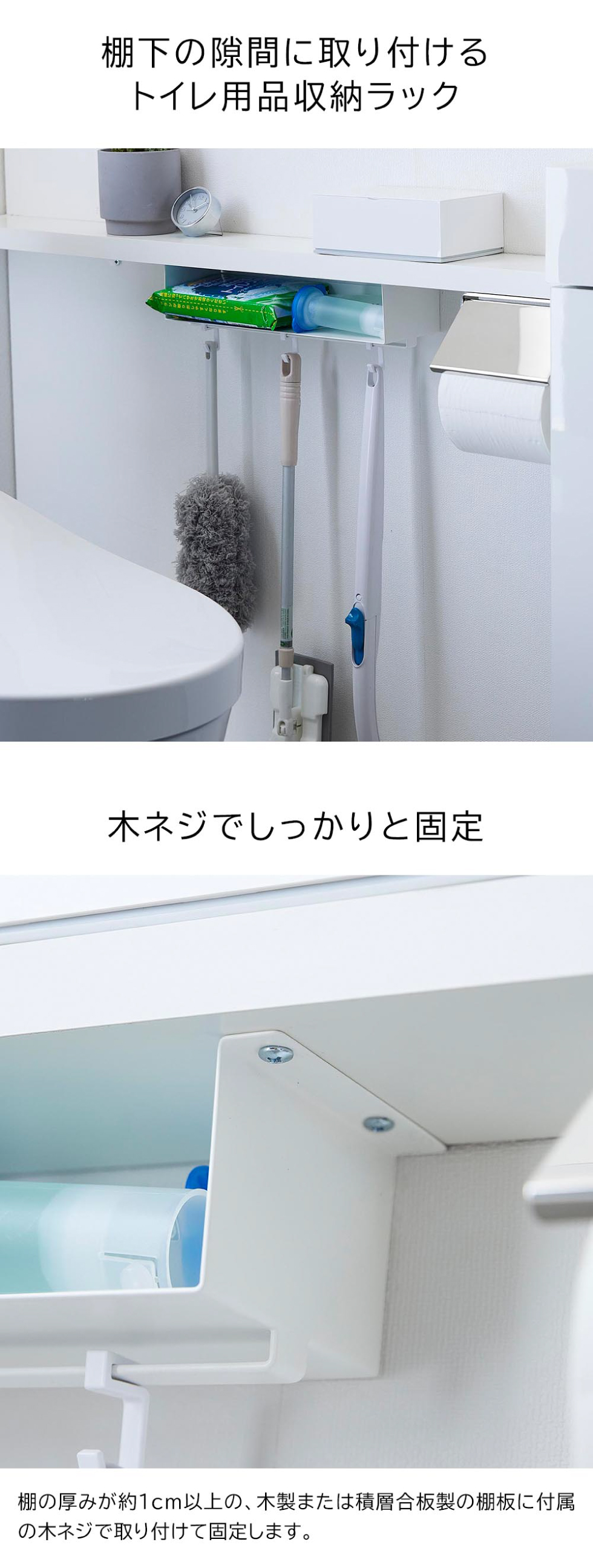 トイレの棚下に取り付けて使うラックです。柄の長いモノを吊り下げ収納したりお掃除シートやトイレ用スタンプなどのトイレ用品をまとめられる隙間収納ができます。木ネジでしっかり固定するので強度も安心。お手持ちの収納ケースを使って、サニタリー用品など細々したもの、ウェットシートや除菌シート、流せるトイレシートなど隠したいものの収納等、アレンジして使うのもおすすめです。