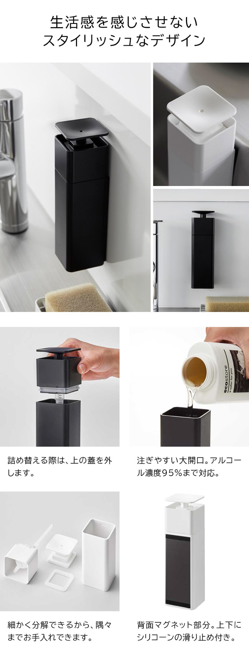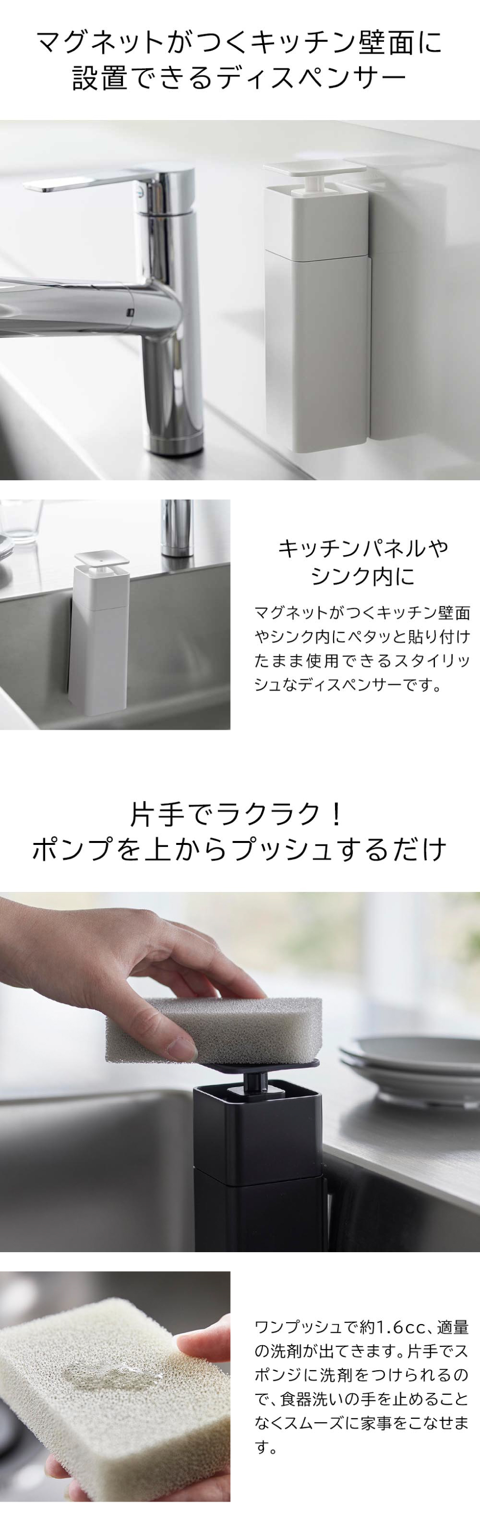マグネットがつく壁面に設置できるスタイリッシュなディスペンサー。ボトルを手に取ることなく、片手でポンプを押すだけで液剤が出てきます。キッチンパネルやシンクに浮かせる収納