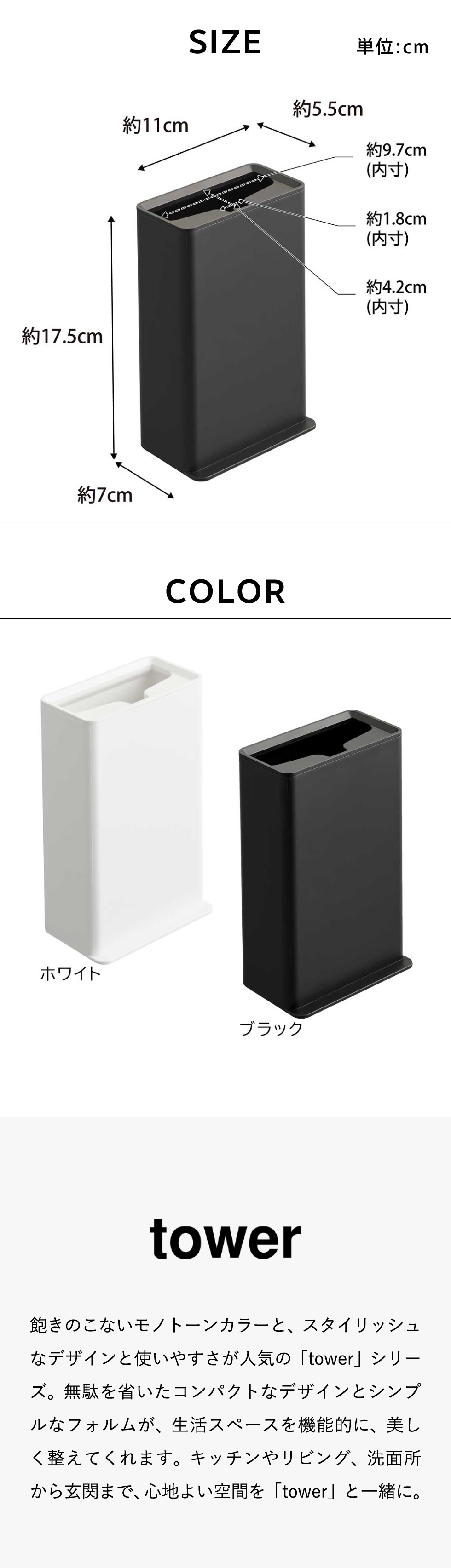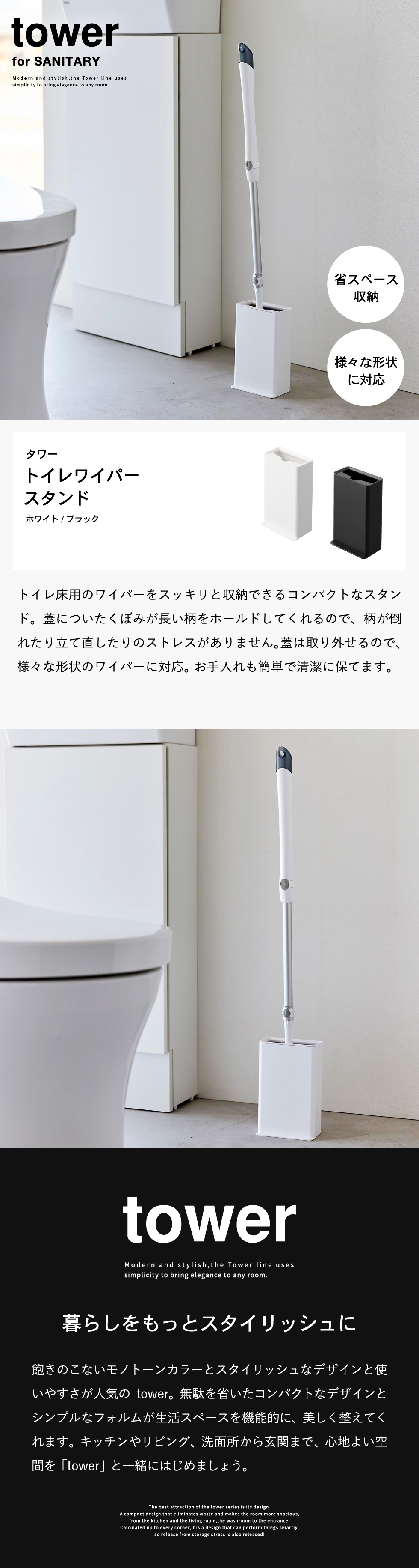 ホワイトとブラックを中心とした飽きのこないモノトーンカラーと、どんなインテリアにもスッと馴染むスタイリッシュなデザイン。そして、とことんシンプルながら、より豊かな暮らしを提案するアイデアがたくさん詰まった、使いやすいアイテムが人気です。無駄を省いたコンパクトなデザインと、シンプルなフォルムが生活スペースを機能的に、美しく整えてくれます。towerのアイテムをライン使いすれば、すっきりとした統一感が生まれ、お洒落でシックな雰囲気を演出します。キッチンやリビング、洗面所から玄関まで揃えたくなるtowerシリーズで、毎日の暮らしを彩る心地よい空間を。