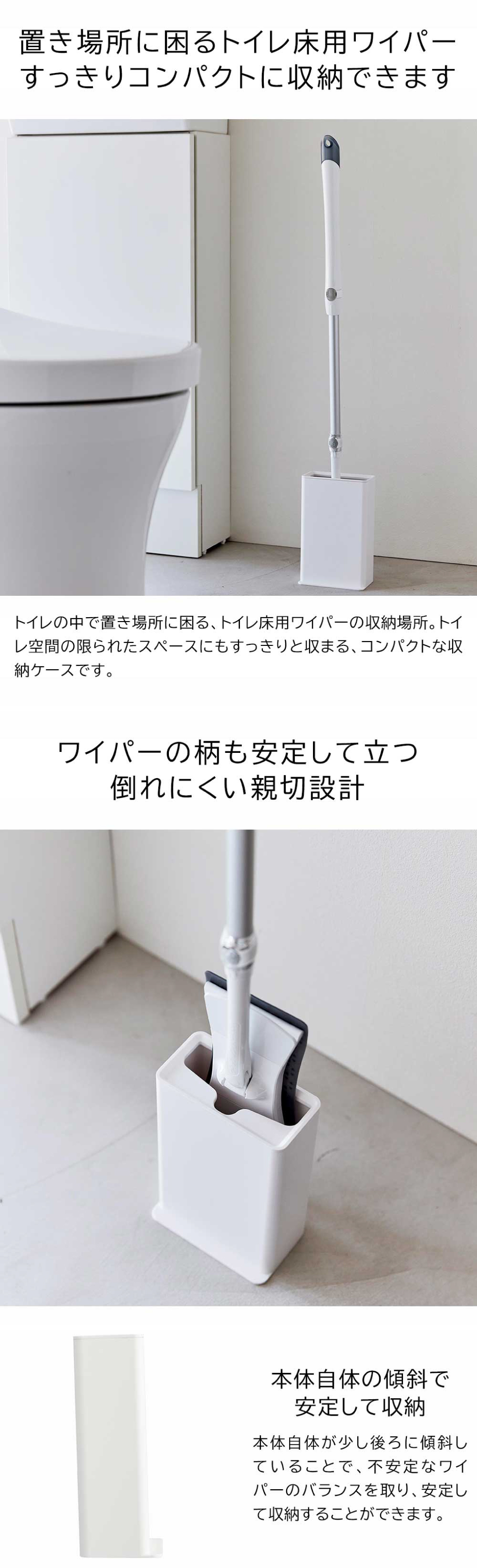 トイレ床用のワイパーをスッキリと収納できる、コンパクトなトイレワイパー専用スタンド。ワイパーをスッキリ立てて収納でき、蓋についたくぼみが長い柄をホールドしてくれるので、柄が倒れたり立て直したりのストレスがなく快適です。