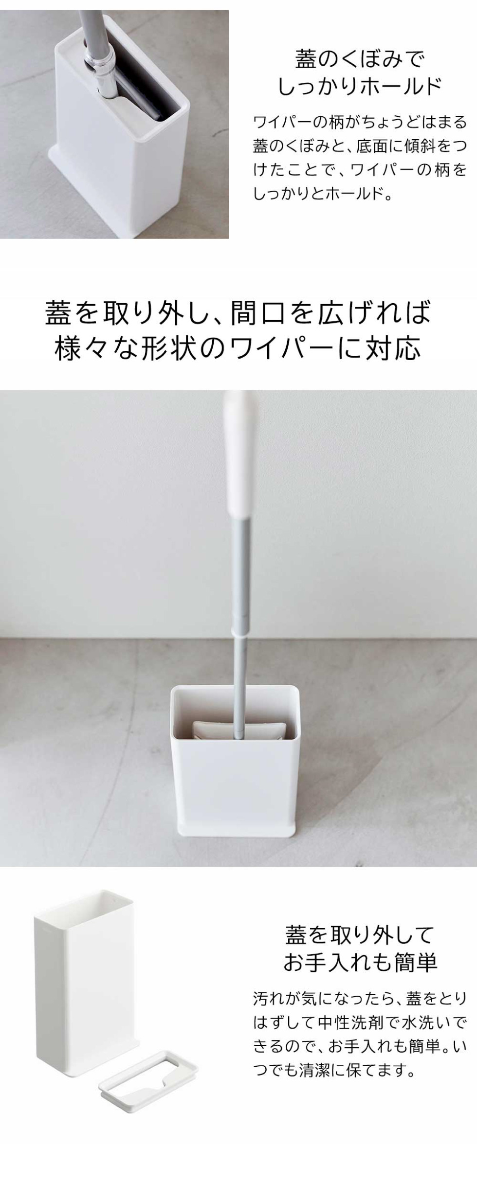 蓋が取り外しできるので、様々な形状のワイパーにも使えます。水洗いもできてお手入れも簡単、いつでも清潔に保てます。