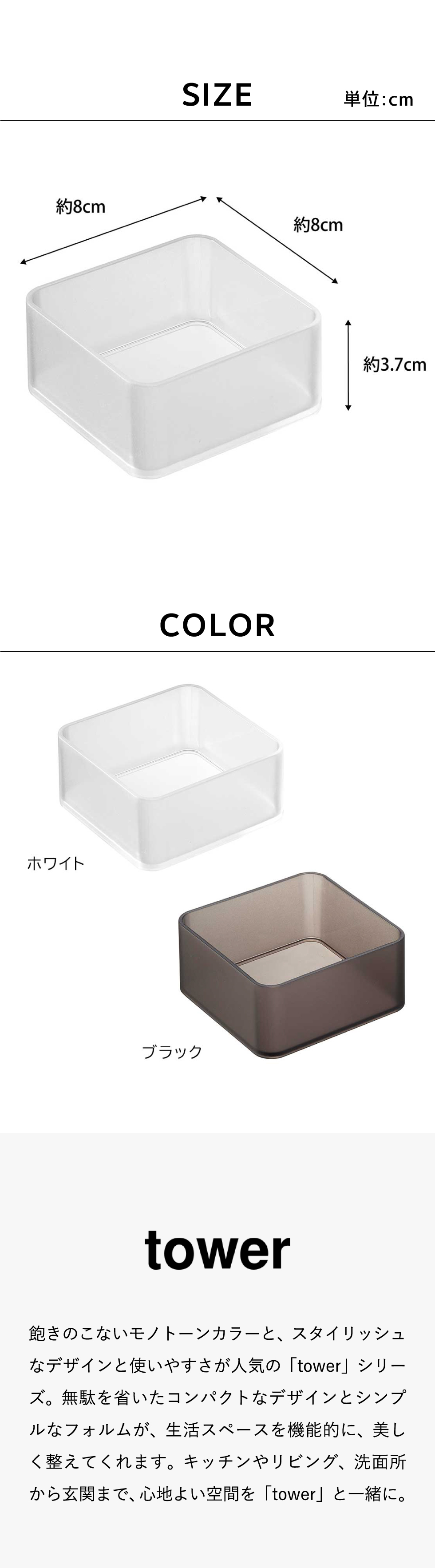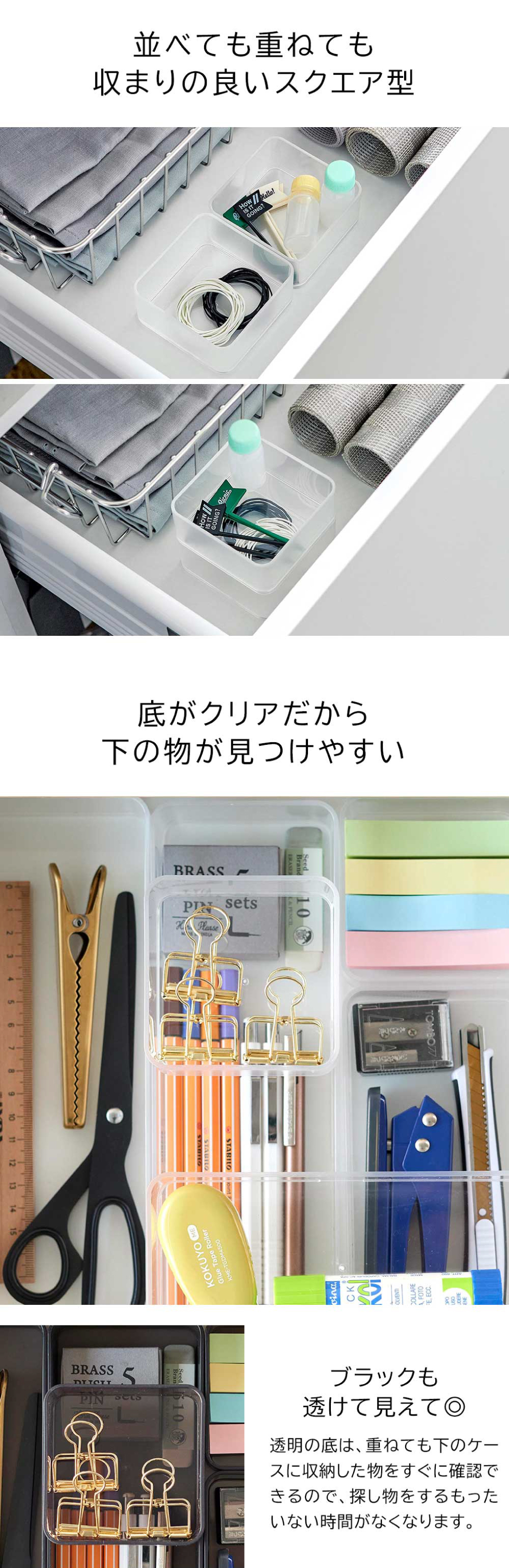底が透明なので、重ねても下の物が見つけやすく、引き出しの整理整頓に活躍するアイテムです。タワーの縦横重ねられる引き出し整理収納ケースの同シリーズと組み合わせてスタッキングするのもおすすめです。