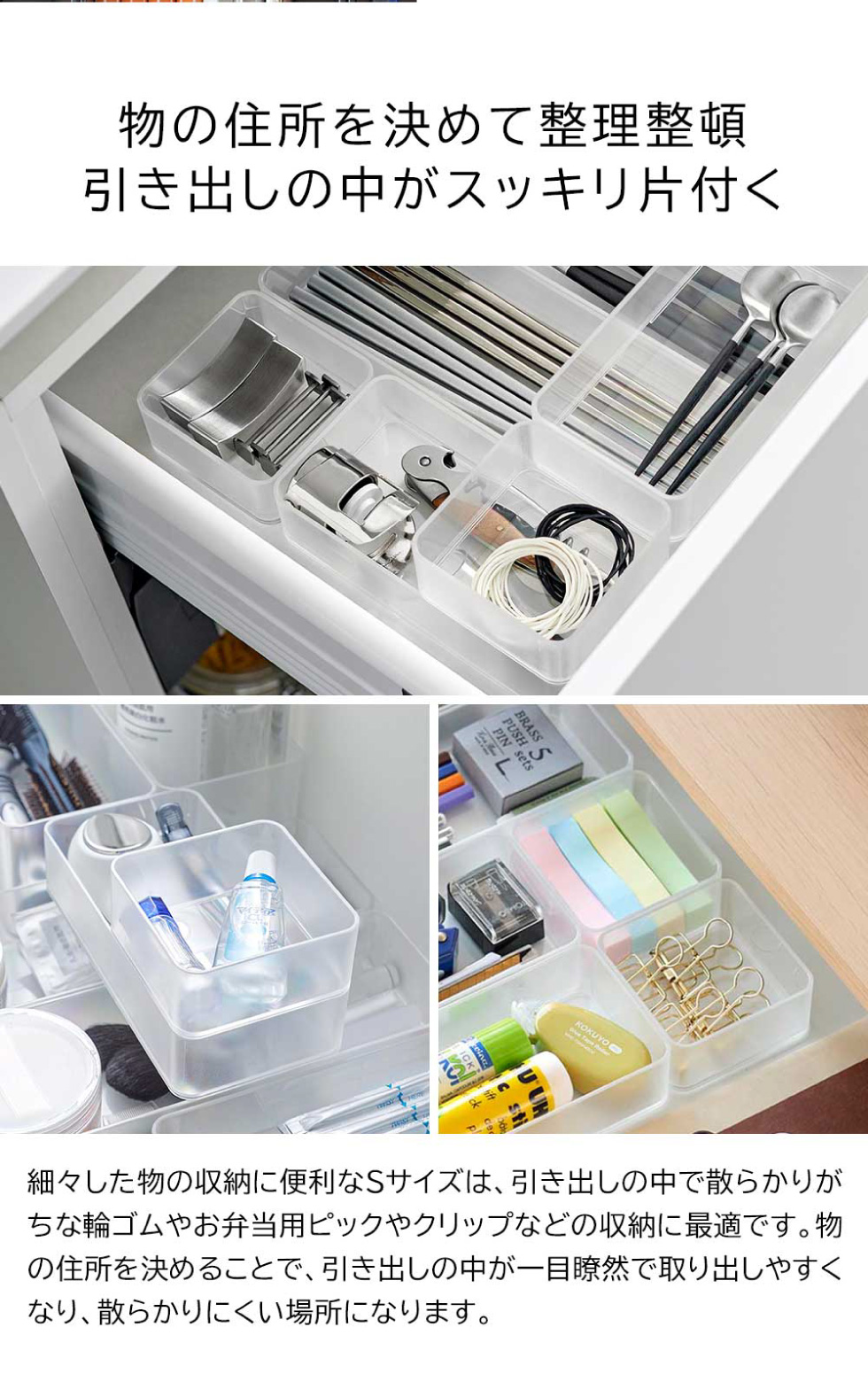 縦横に並べて、引き出しの中の細かいモノを整理できる収納ケース。8cm四方で、大きすぎず小さすぎない、縦や横に2個並べても収まりのいいちょうどいいサイズ。キッチンで散らかりがちな輪ゴムやお弁当ピック、デスクまわりのクリップや付箋、洗面小物などの収納に便利です。