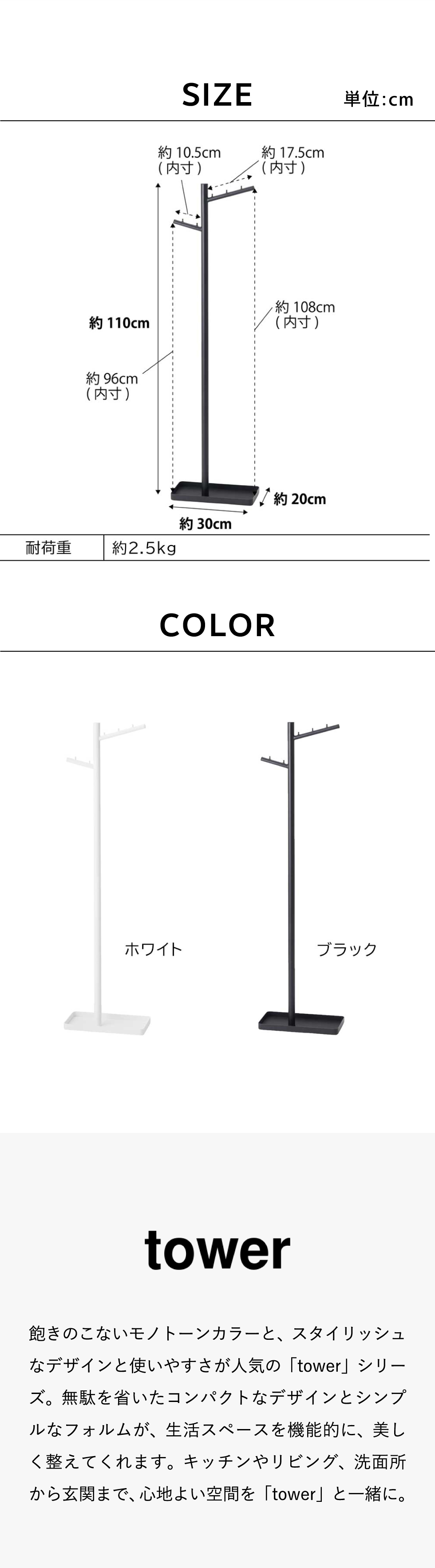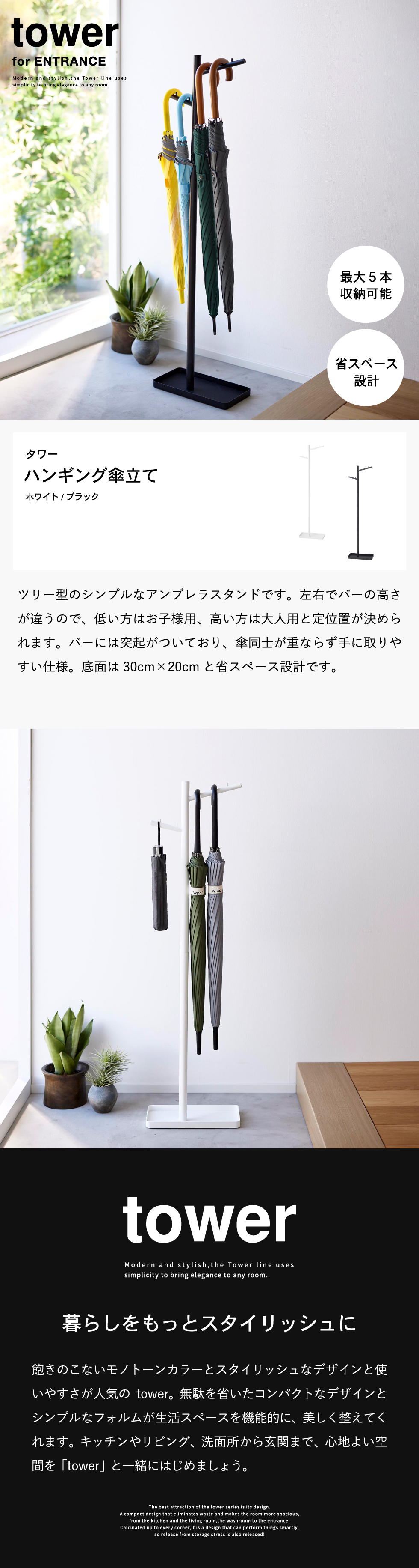 ホワイトとブラックを中心とした飽きのこないモノトーンカラーと、どんなインテリアにもスッと馴染むスタイリッシュなデザイン。そして、とことんシンプルながら、より豊かな暮らしを提案するアイデアがたくさん詰まった、使いやすいアイテムが人気です。無駄を省いたコンパクトなデザインと、シンプルなフォルムが生活スペースを機能的に、美しく整えてくれます。towerのアイテムをライン使いすれば、すっきりとした統一感が生まれ、お洒落でシックな雰囲気を演出します。キッチンやリビング、洗面所から玄関まで揃えたくなるtowerシリーズで、毎日の暮らしを彩る心地よい空間を。
