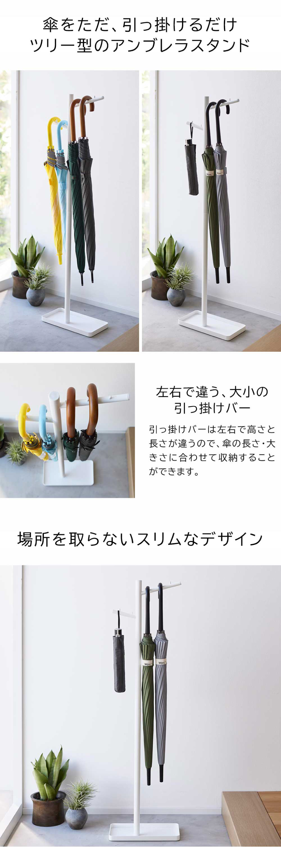 バーには突起がついており、傘同士が重ならず最大5本まで収納可能。お子様用の小さい傘や折り畳み傘、靴べらなど一箇所にスッキリ収納できます。適度に傘同士の間隔があるので、傘を取るときも掛けるときもストレスなく使いやすく、風通しが良いのも嬉しいポイント。底面は30cm×20cmと省スペース設計で、限られた玄関スペースでも場所を取らないスリムなデザインです。