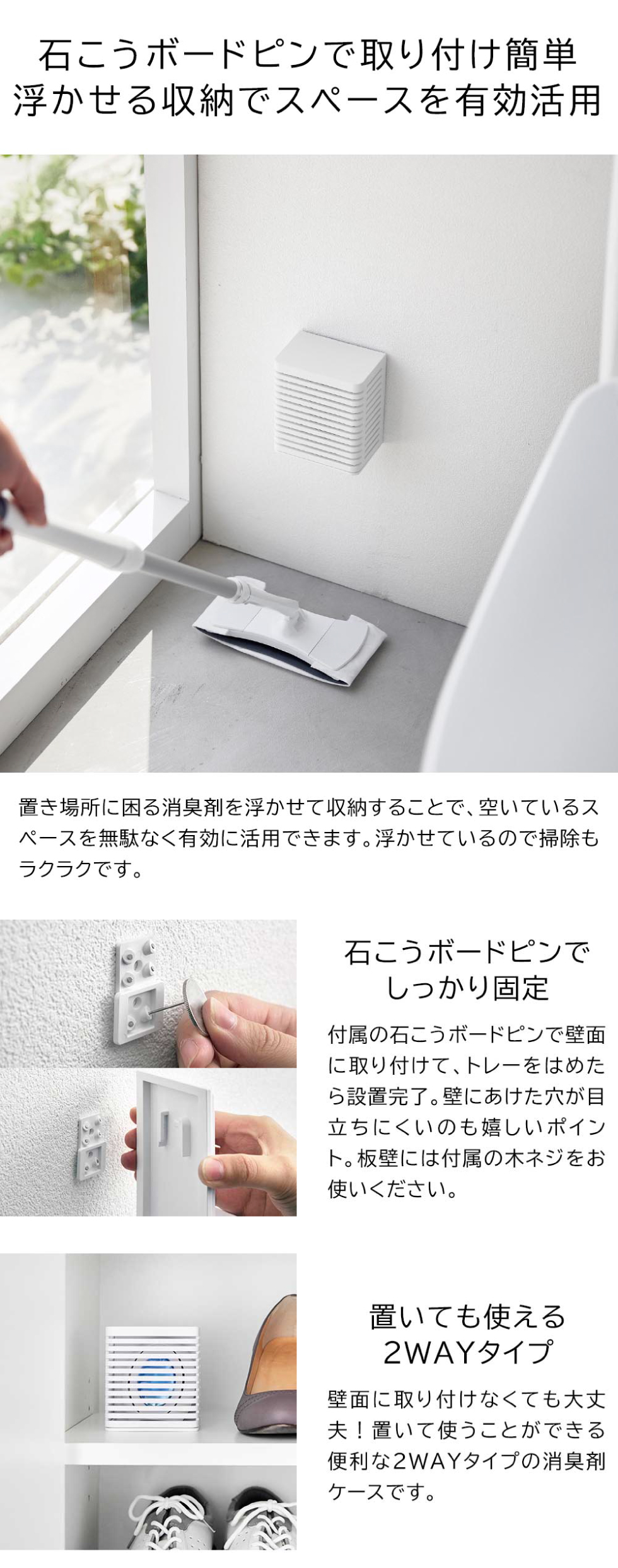 置き場所に困る消臭剤を浮かせて収納できるケース。壁の穴が目立ちにくい石こうボードピンで取り付け可能(壁の材質によって付属の石こうボードピン/木ネジ、どちらでも設置できます)。玄関近くや浴室、トイレの壁など、生活感が出やすい消臭剤を隠してスッキリと収納できます。浮かせているので床のお掃除も簡単。下駄箱の奥や棚の上、ゴミ箱の近く、床など置いても使える2WAYタイプです。