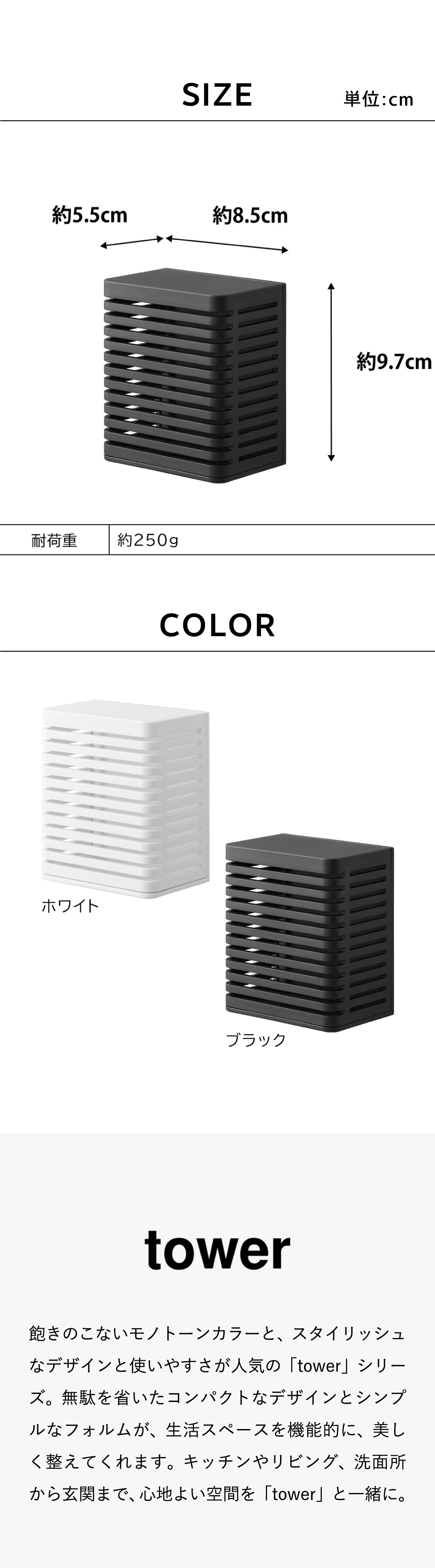 ホワイトとブラックを中心とした飽きのこないモノトーンカラーと、どんなインテリアにもスッと馴染むスタイリッシュなデザイン。そして、とことんシンプルながら、より豊かな暮らしを提案するアイデアがたくさん詰まった、使いやすいアイテムが人気です。無駄を省いたコンパクトなデザインと、シンプルなフォルムが生活スペースを機能的に、美しく整えてくれます。towerのアイテムをライン使いすれば、すっきりとした統一感が生まれ、お洒落でシックな雰囲気を演出します。キッチンやリビング、洗面所から玄関まで揃えたくなるtowerシリーズで、毎日の暮らしを彩る心地よい空間を。