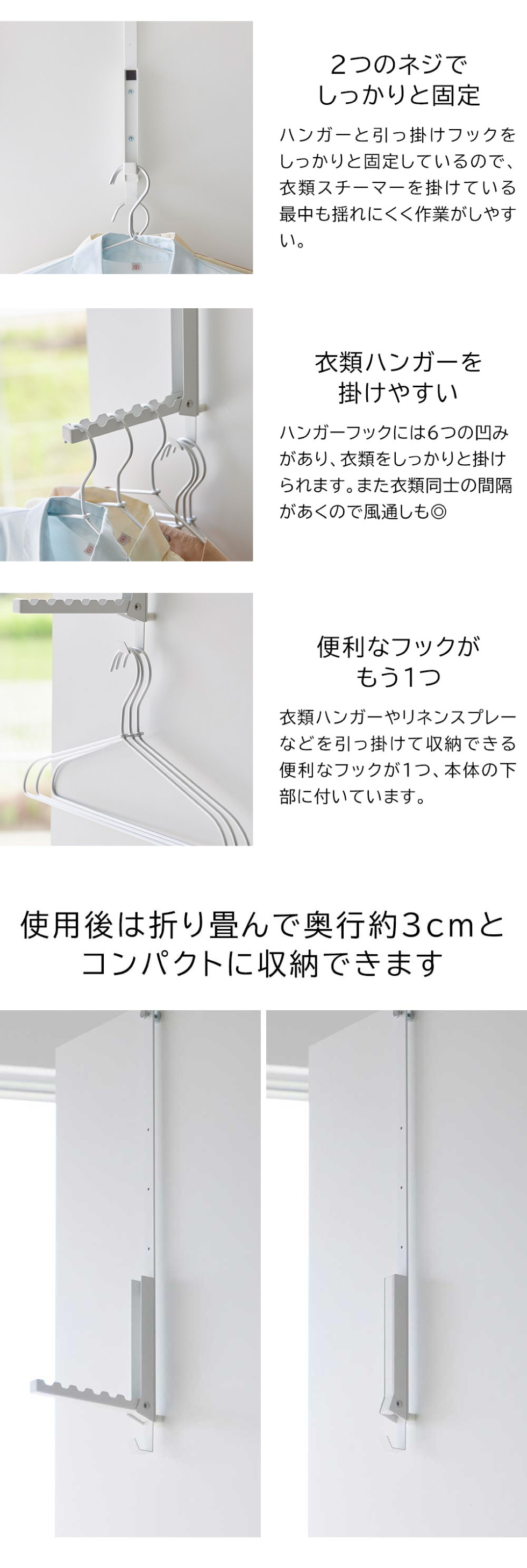 使わない時はスリムに折り畳み収納ができる衣類スチーマー用のハンガー。取り付けは簡単、ドアに引っ掛けるだけでOK。ハンガーの高さも4段階で調整可能。 タワーシリーズ yamazaki