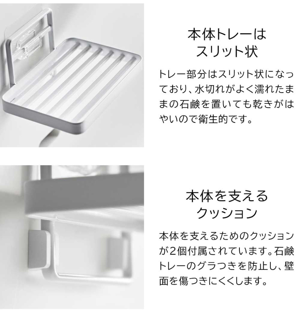 フィルムフックで簡単に取り付けられるソープトレーです。トレー部分はスリット状になっており、水受けトレーがないので水キレがいい構造。石鹸がすばやく乾き、ドロドロと石鹸が溶けてしまうストレスから解放されます。