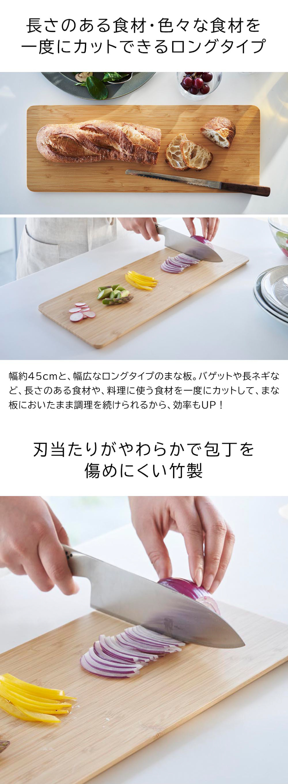 長さのある食材や、調理する食材を一度にカットできる、ロングタイプのまな板。刃当たりのやわらかい竹製