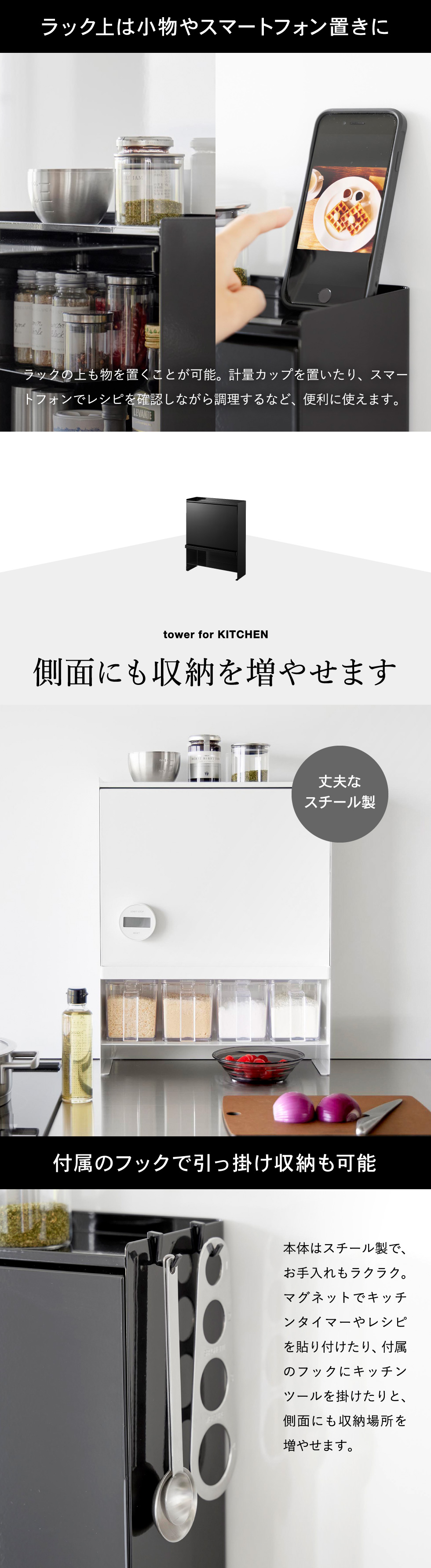 耐荷重 天板:約1kg 調味料収納部:約3kg ストッカー収納部:約3kg マグネットスパイス棚:約1kg フック1つあたり:約250g |