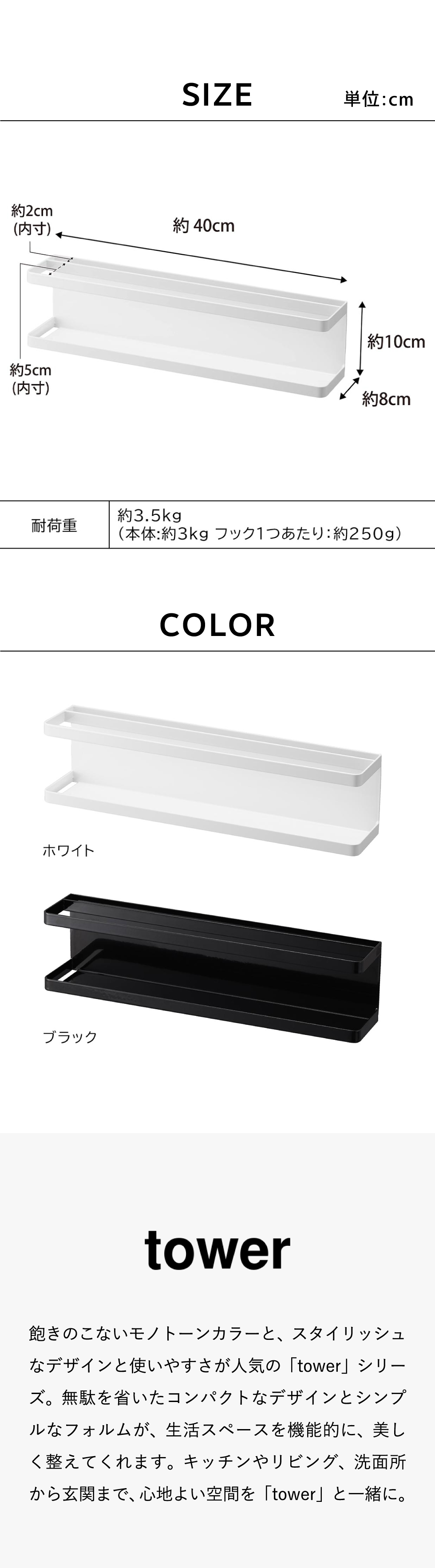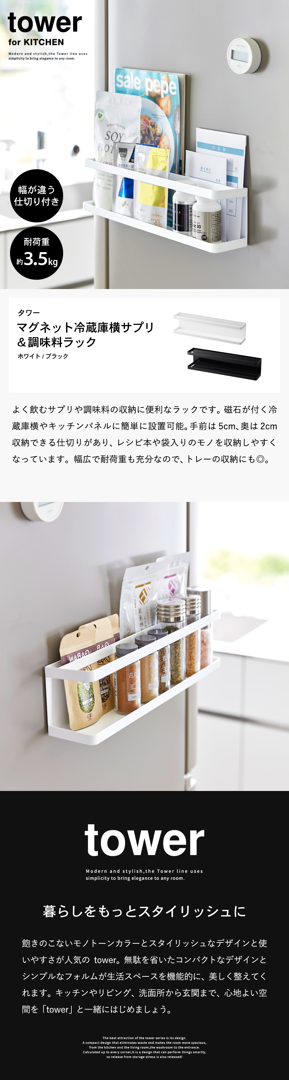 マグネット冷蔵庫横サプリ&調味料ラック タワー 山崎実業 tower キッチン 2188 2189 ホワイト ブラック