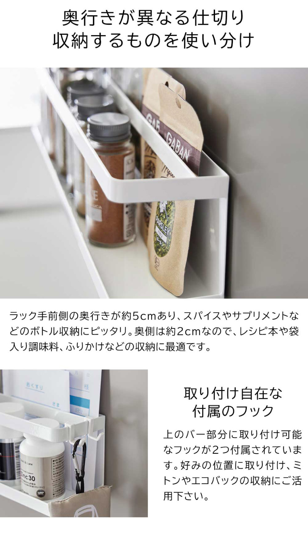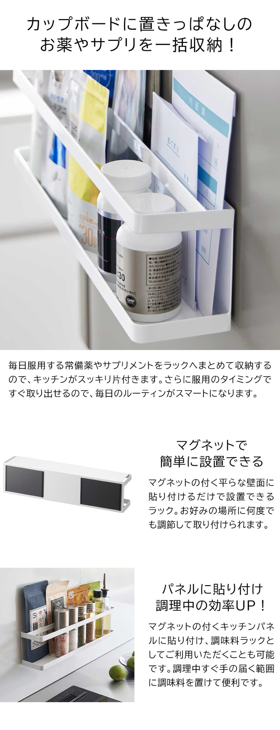 常備薬やサプリメントを一括収納できるラック。マグネットで簡単に貼り付け可能。奥行き8cmとスリム、冷蔵庫横の隙間を有効活用。付属のフックにミトンやエコバックを掛けられる。