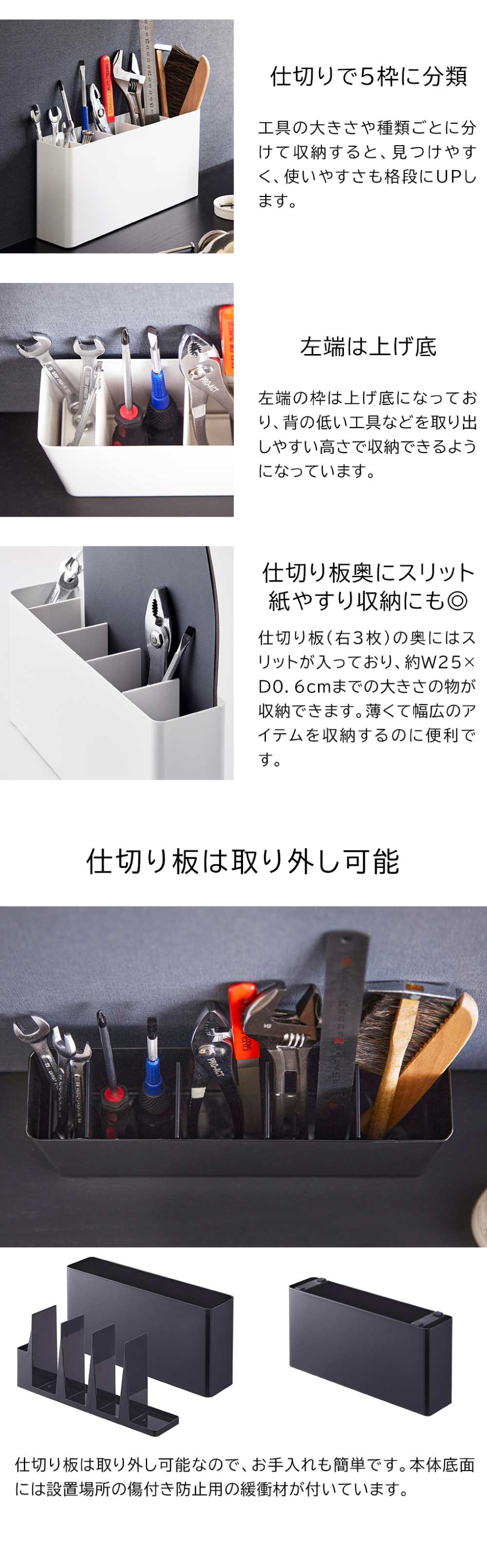 工具をスッキリまとめて作業台に置ける、奥行きスリムな工具スタンド。仕切り付きで様々な工具を綺麗に立てて収納できます。 白 黒 シンプル おしゃれ