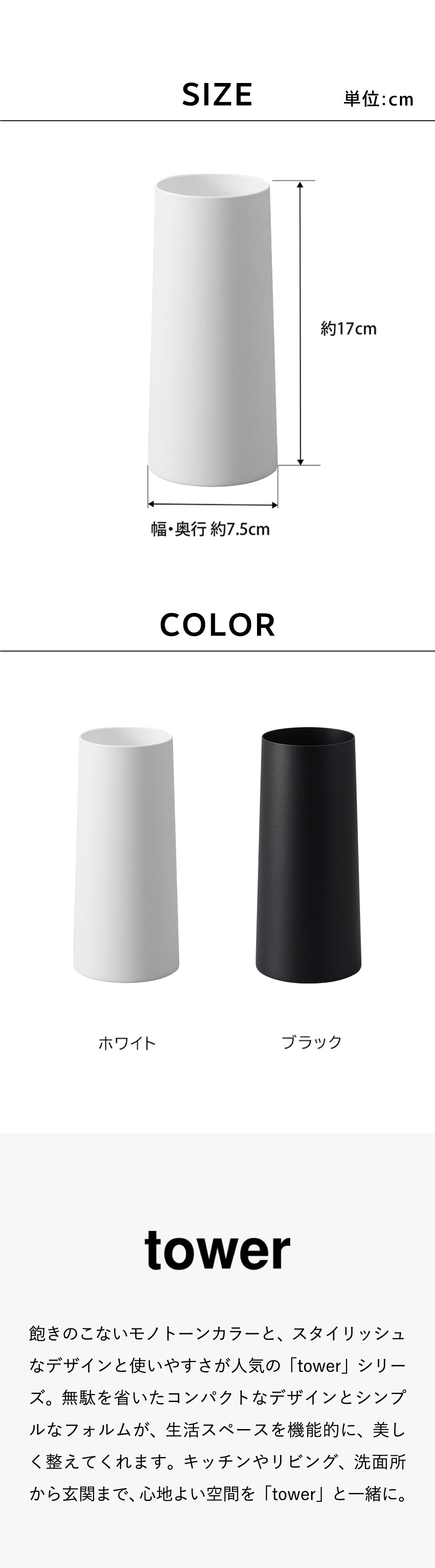 ホワイトとブラックを中心とした飽きのこないモノトーンカラーと、どんなインテリアにもスッと馴染むスタイリッシュなデザイン。そして、とことんシンプルながら、より豊かな暮らしを提案するアイデアがたくさん詰まった、使いやすいアイテムが人気です。無駄を省いたコンパクトなデザインと、シンプルなフォルムが生活スペースを機能的に、美しく整えてくれます。towerのアイテムをライン使いすれば、すっきりとした統一感が生まれ、お洒落でシックな雰囲気を演出します。キッチンやリビング、洗面所から玄関まで揃えたくなるtowerシリーズで、毎日の暮らしを彩る心地よい空間を。
