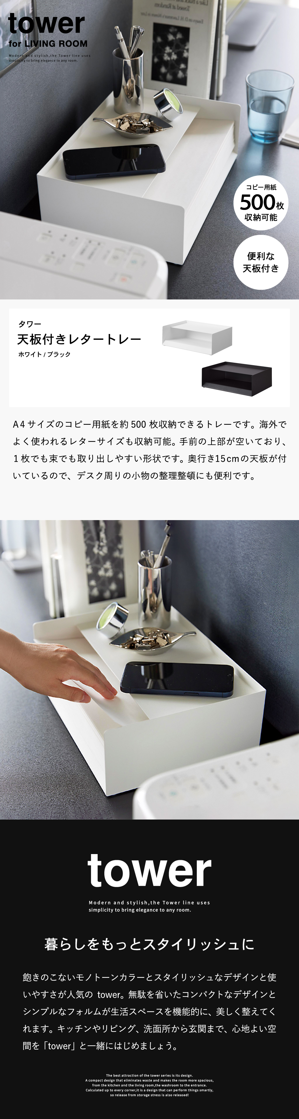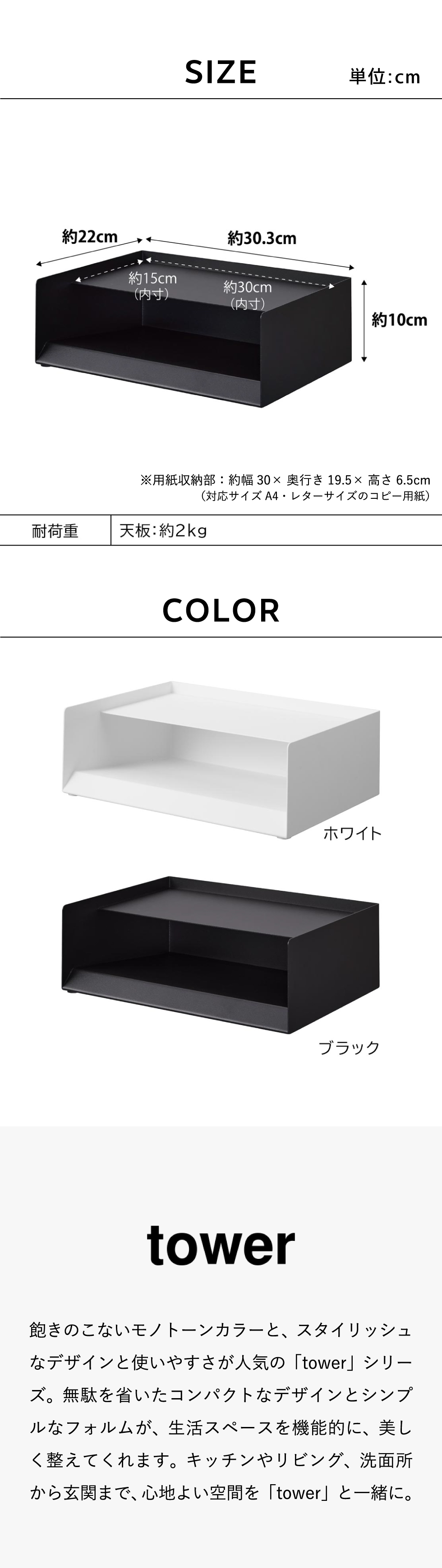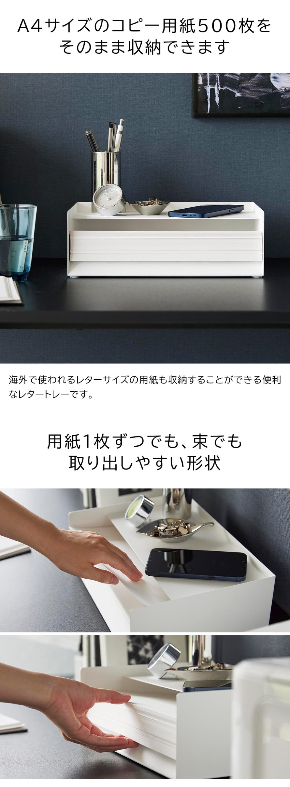 A4サイズのコピー用紙を約500枚収納できるトレーです。1枚でも束でも取り出しやすい形状。海外でよく使われるレターサイズの用紙も収納可能です。