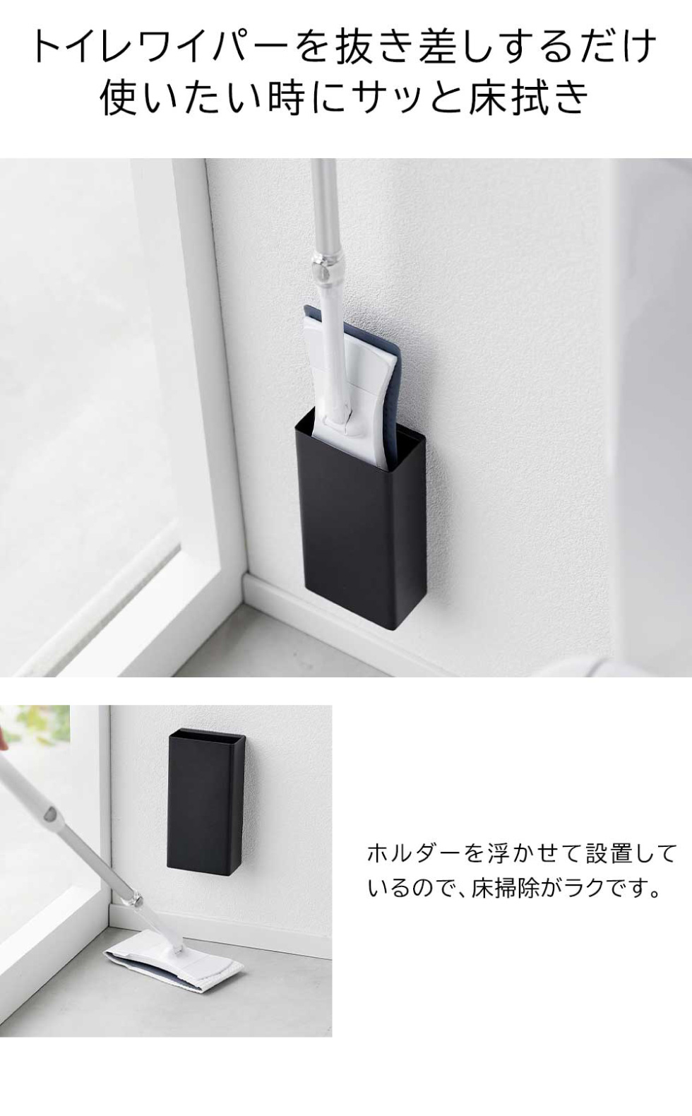 トイレワイパーを浮かせて収納できるホルダーです。置き場所に困る生活感の出やすいアイテムも、スリムな形状のボックスに収納することで空間全体がスッキリ。定位置に取り付けているので、使いたい時にサッと取り出せて便利。浮かせているので、床のお掃除もスムーズです。