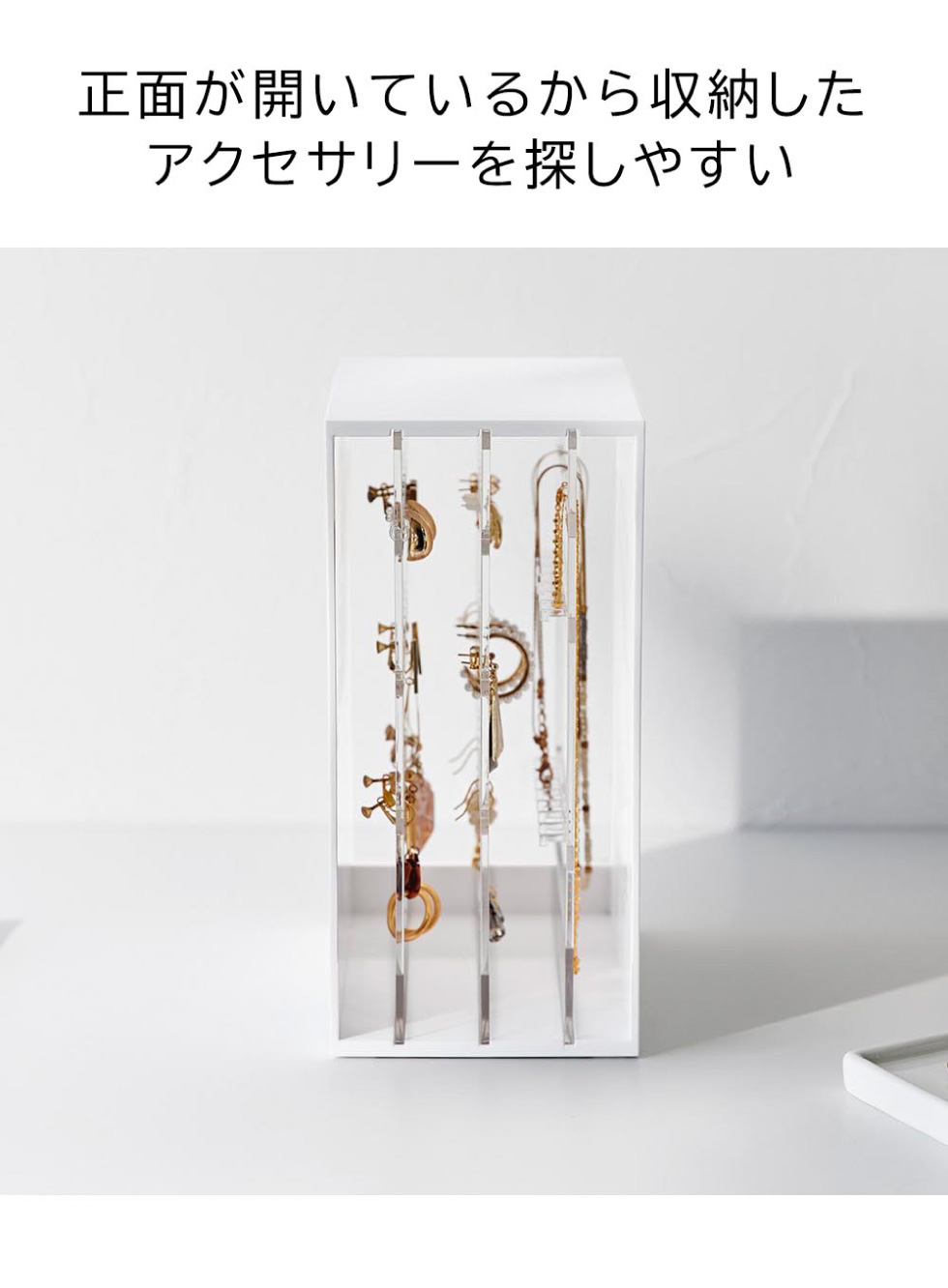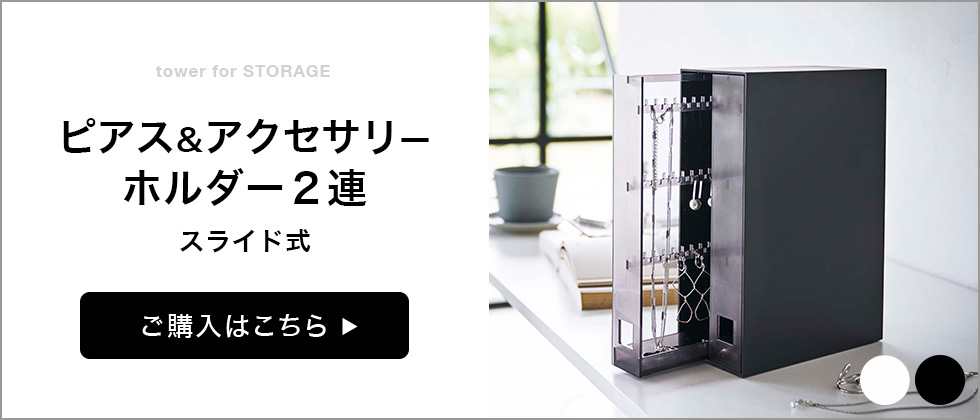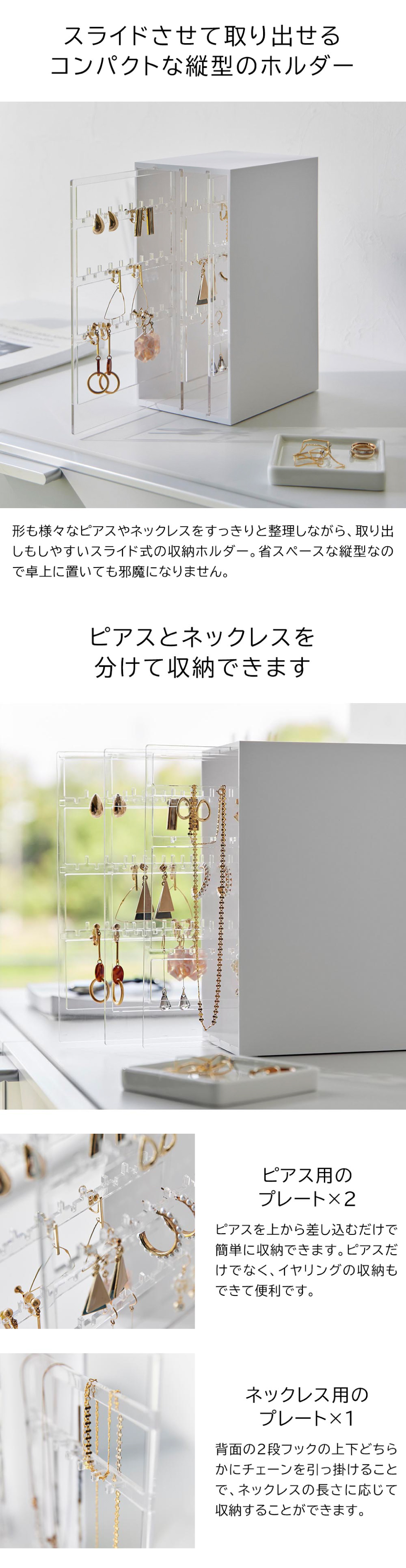 スライドさせて取り出すホルダーです。ピアス用プレートが2枚/ネックレス用プレートが1枚の3連式。省スペースで大容量の収納が叶います。正面が開いているので収納しているアクセサリーが見えてる探しやすい仕様です。