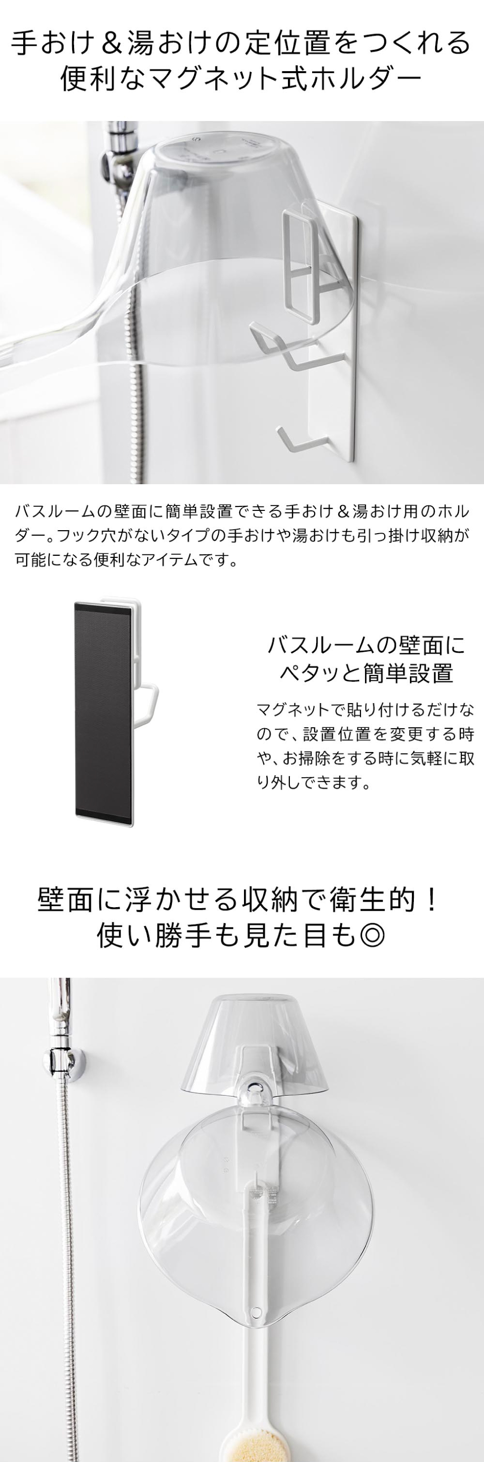 強力マグネットでバスルームの壁面に簡単に設置できる手おけ&湯おけホルダーです。フック穴がないタイプの手おけや湯おけも引っ掛け収納が可能。湯おけ用ホルダーは、乾きやすいように斜めに引っ掛けられる設計になっています。マグネット式なので、設置位置の変更や掃除をする時の取り外しが気軽にできます。