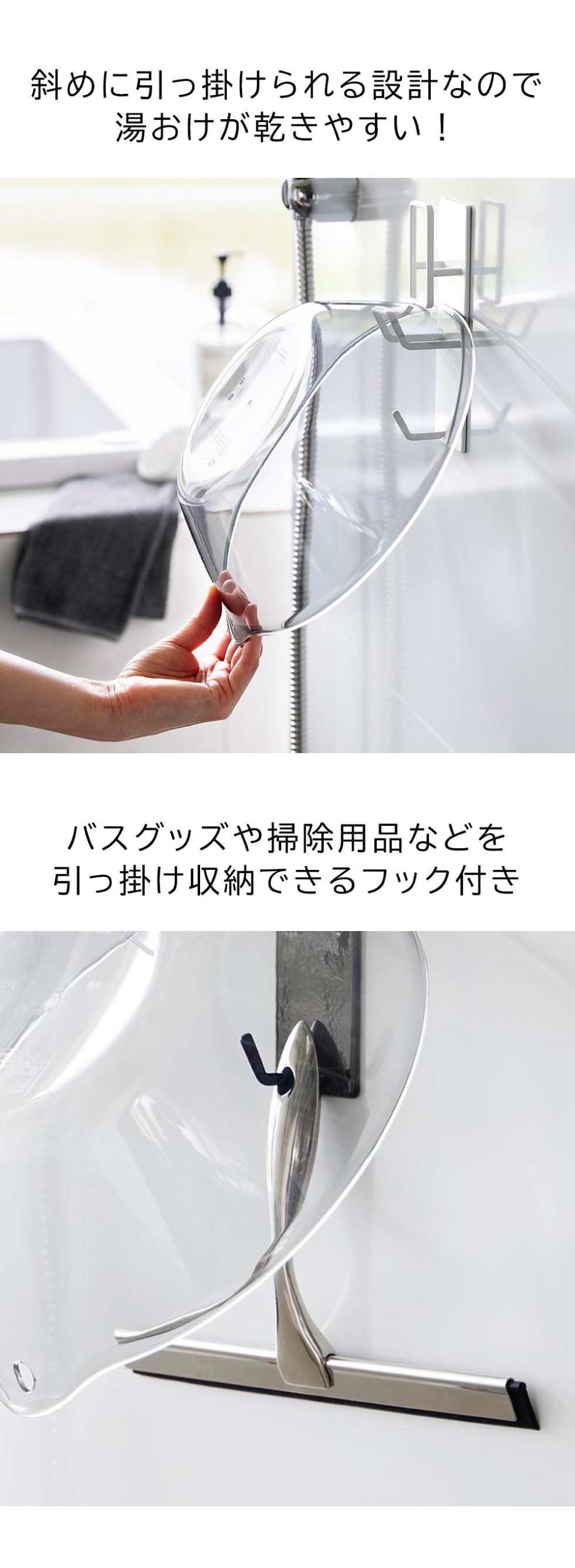 一番下のフックには、泡立てネットや洗顔ブラシなどのバスグッズ、スプレーボトルや水切りワイパーなどの掃除用品、ちょっとした小物を引っ掛けて収納することができます。水アカやヌメリが気になる浴室も、壁面に浮かせてモノを収納することで乾きやすく、衛生的に保てます。