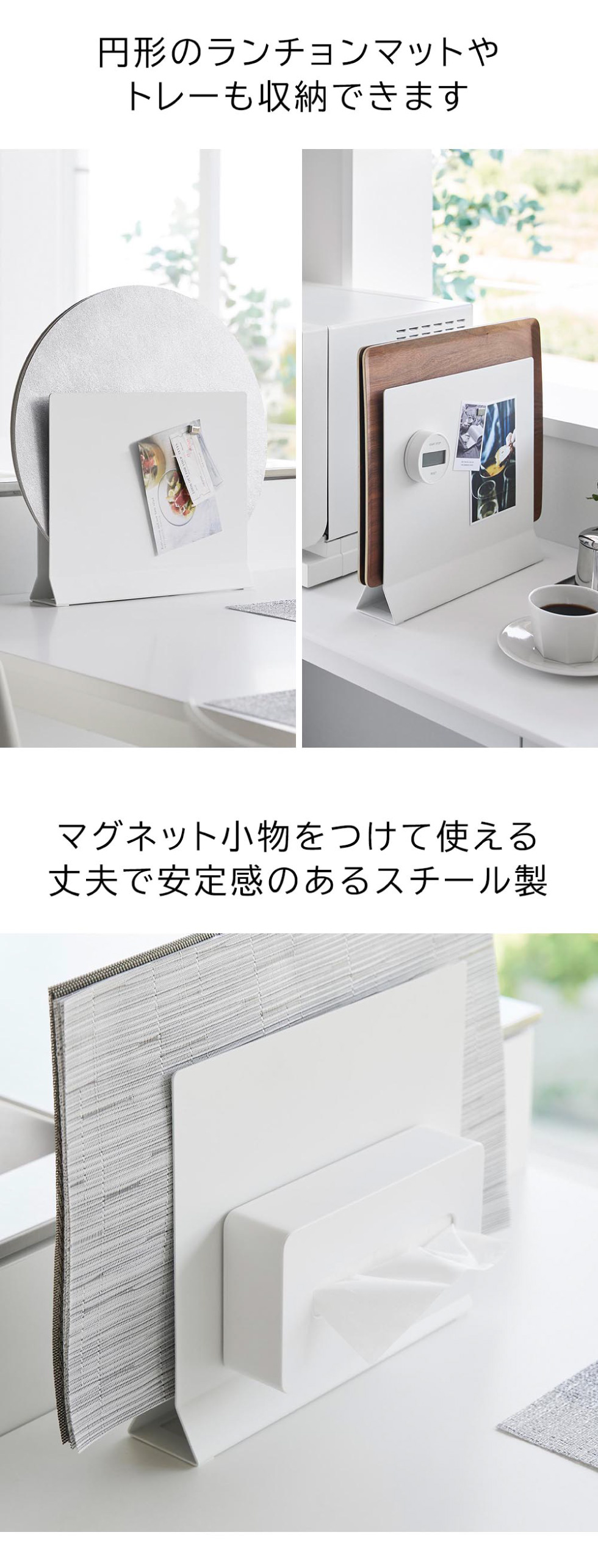 スクエア型はもちろん、円形のランチョンマットも立てて収納できるスタンドです。幅約6.5cmとスリムな形状で、電子レンジの横や調理台の奥、テーブルの隅の方に置いても邪魔になりません。厚さ約2.4cmまで入るので、キッチントレーも収納可能。設置面から3cm浮かせて収納できるため、埃がつかず衛生的に保てます。
