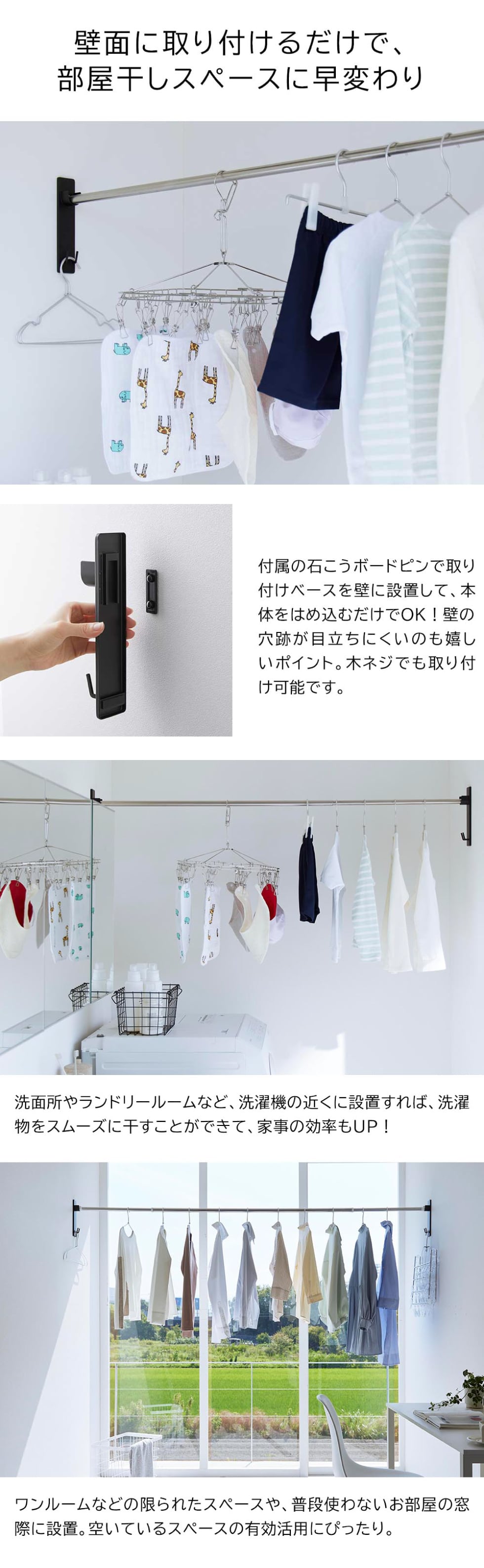 洗面所やランドリールーム、リビングなどの壁面に取り付けて、お好みの場所を部屋干しスペースに!壁の穴跡が目立ちにくい石こうボードピンで簡単に取り付けできます。 yamazaki