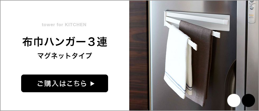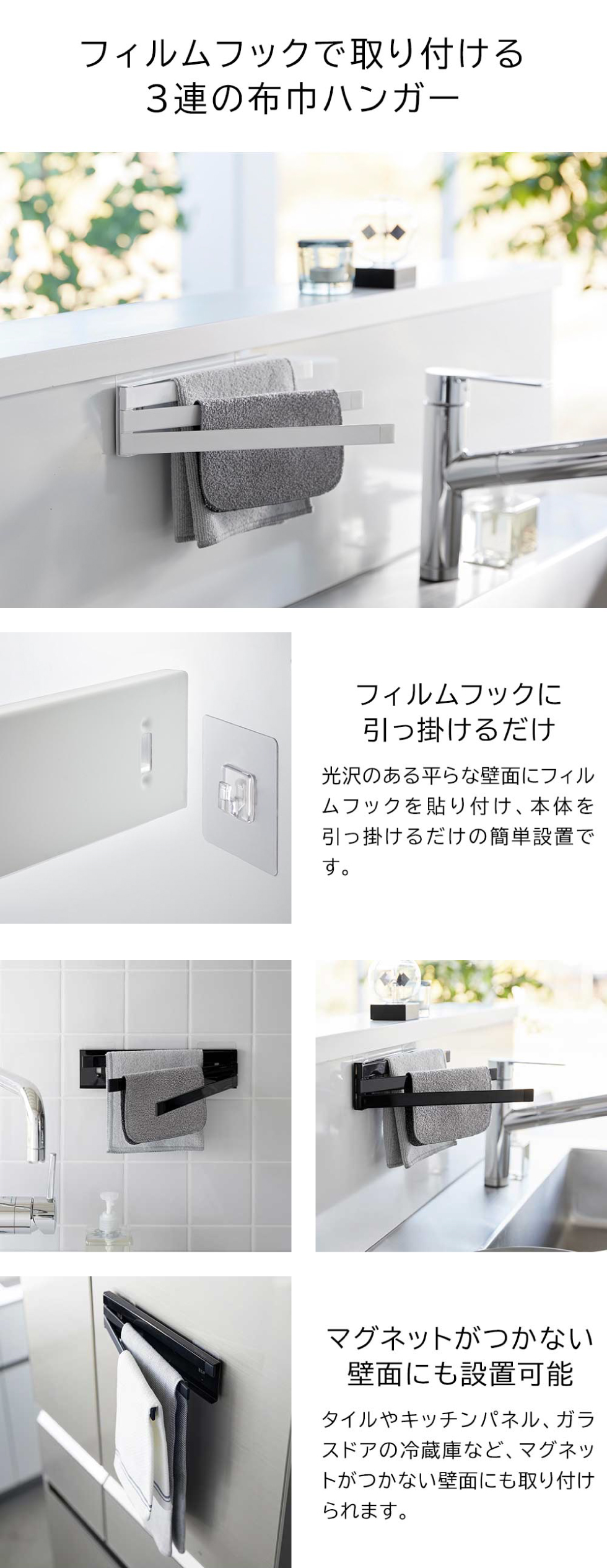 フィルムフックで簡単に取り付けできる3連式の布巾(ふきん)ハンガー。マグネットのつかないタイルやガラスドアの冷蔵庫、キッチンパネルなど、光沢のある壁面に簡単に取り付け可能。ハンガーが3本あるので、台拭き用、食器拭き用、調理台用など、使い分けている布巾を一箇所にまとめて収納できます。