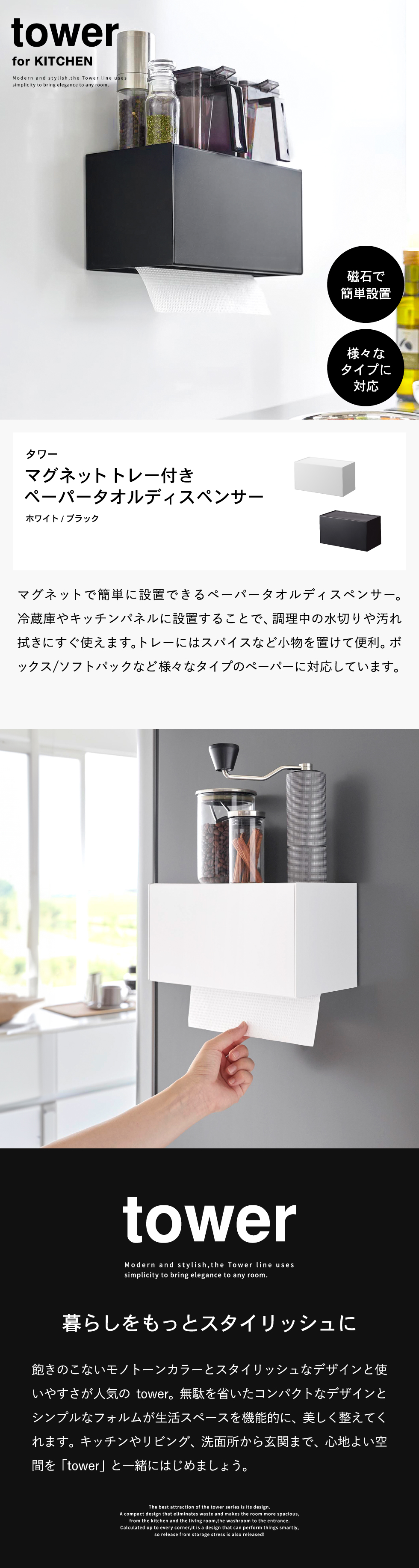 ホワイトとブラックを中心とした飽きのこないモノトーンカラーと、どんなインテリアにもスッと馴染むスタイリッシュなデザイン。そして、とことんシンプルながら、より豊かな暮らしを提案するアイデアがたくさん詰まった、使いやすいアイテムが人気です。無駄を省いたコンパクトなデザインと、シンプルなフォルムが生活スペースを機能的に、美しく整えてくれます。towerのアイテムをライン使いすれば、すっきりとした統一感が生まれ、お洒落でシックな雰囲気を演出します。キッチンやリビング、洗面所から玄関まで揃えたくなるtowerシリーズで、毎日の暮らしを彩る心地よい空間を。