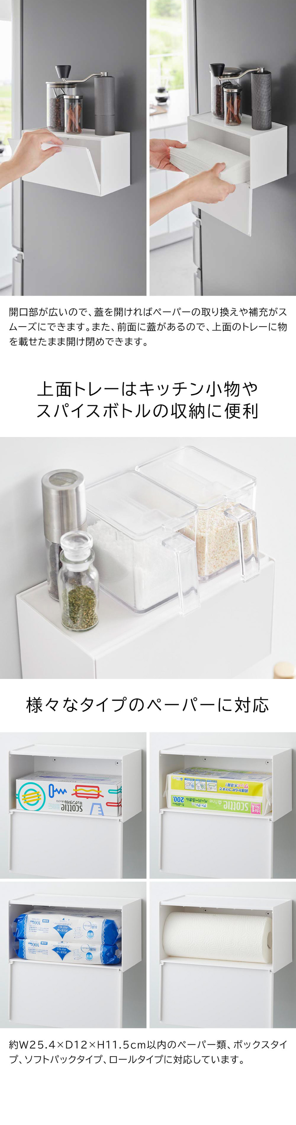 対応サイズ 対応ペーパー:約W25.4×D12×H11.5cm以内 ※ペーパーは個包装から出して使用できます。 ● ペーパータオル:ボックス/ソフトタイプ ● キッチンペーパー:ボックス/ソフト/ロールタイプ ● ティッシュペーパー:ボックス/ソフトタイプ ※一般的なペーパータオル、キッチンペーパー、ティッシュペーパーを想定していますが、サイズや形状によって対応しない場合があります。 ※ペーパーの材質、厚み、固さ、量によって出し入れのし易さが異なります。 |