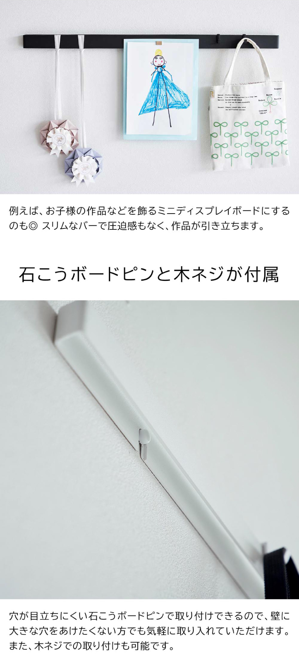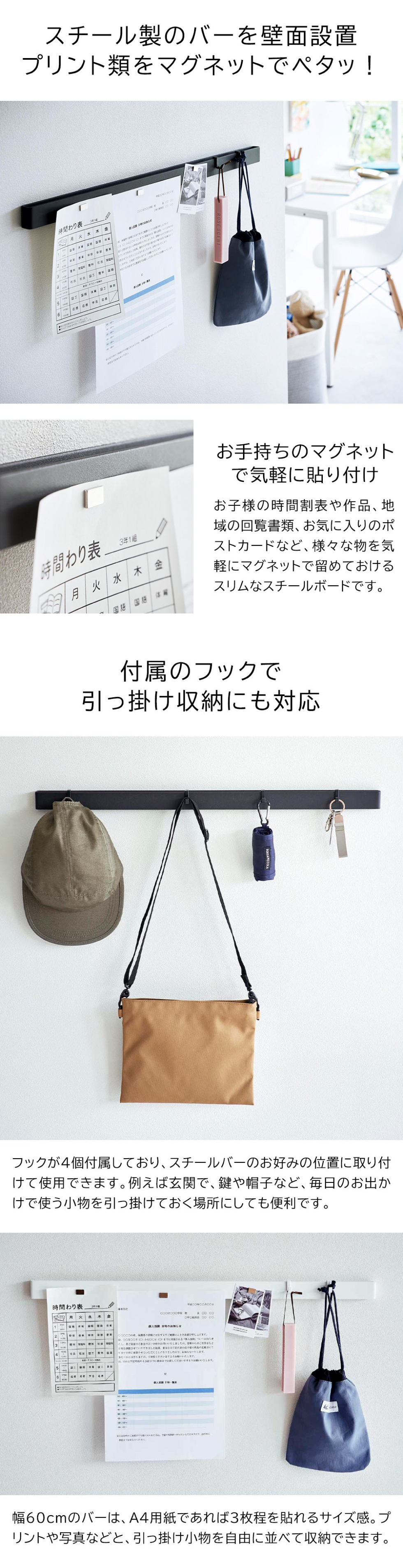 付属の石こうボードピンか木ネジで壁面に取り付けて、マグネットでモノをくっつけられるスチールバーです。目につくところに置いておきたい大事な書類や、いつも眺めておきたい写真やポストカードを横並びに貼り付け可能。子供部屋では、お子様の身長に合わせてプリントや時間割表を貼り付けることができます。