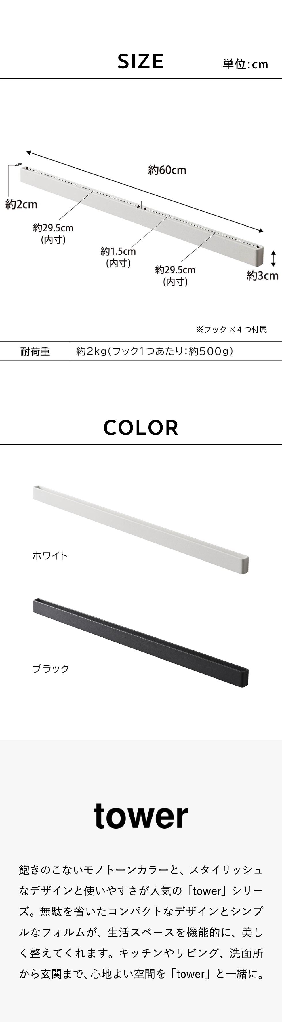 可動式のフックが付属しているので、お好みの位置に取り付け、鍵や手提げバッグなど、普段使いの小物を引っ掛けて収納すると更に便利になります。幅約60cmと充分な収納幅がありながら、奥行き約2cmとワイド&スリムな設計で、子供部屋やリビング、廊下や玄関など、お部屋の様々な場所で大活躍する収納ツールです。