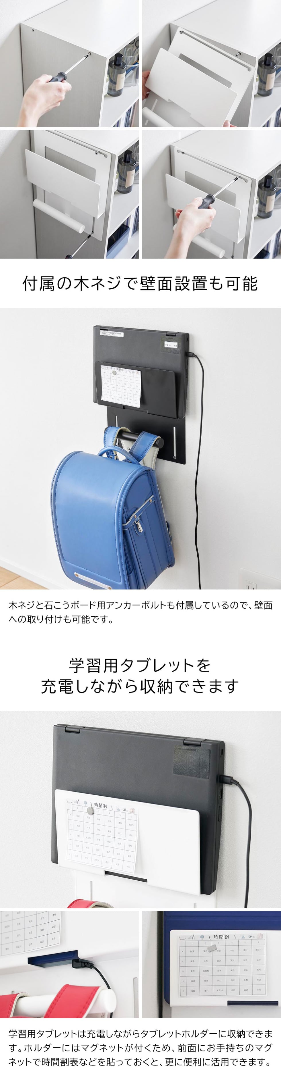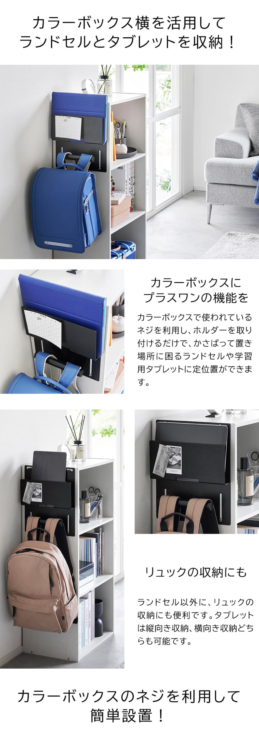 カラーボックス横にランドセルと学習用タブレットを収納できるホルダーです。カラーボックスのネジを利用して簡単に設置可能。付属の木ネジと石こうボード用アンカーボルトで壁面にも取り付けられます。通学に必要な物の定位置を決めておくと、翌日の準備もスムーズです。