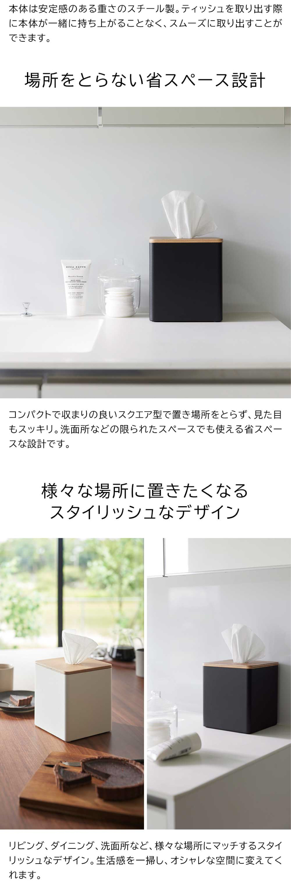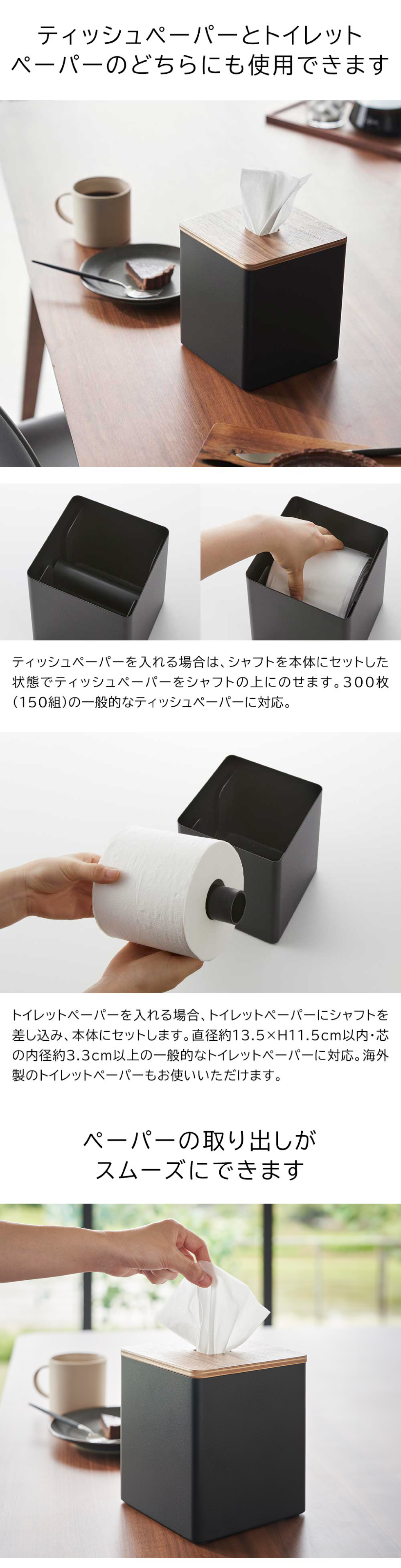 ティッシュペーパーとトイレットペーパーのどちらにも対応!上からサッとスムーズに取り出せる、オシャレでコンパクトなスクエア型のスチール製ペーパーケース。 yamazaki