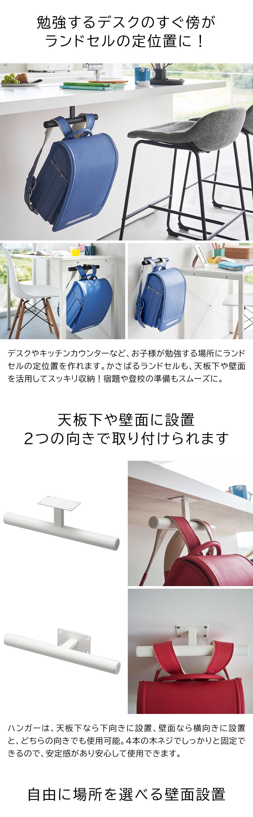 置き場所が定まりにくいランドセルやリュックも、定位置を作って収納することで散らかるのを防止することができます。耐荷重は10kgで、4本の木ネジでしっかりと固定するので、安定感があり安心して使用可能。ハンガーに掛けたまま教科書を出し入れできるので、宿題や翌日の持ち物の準備もスムーズです。