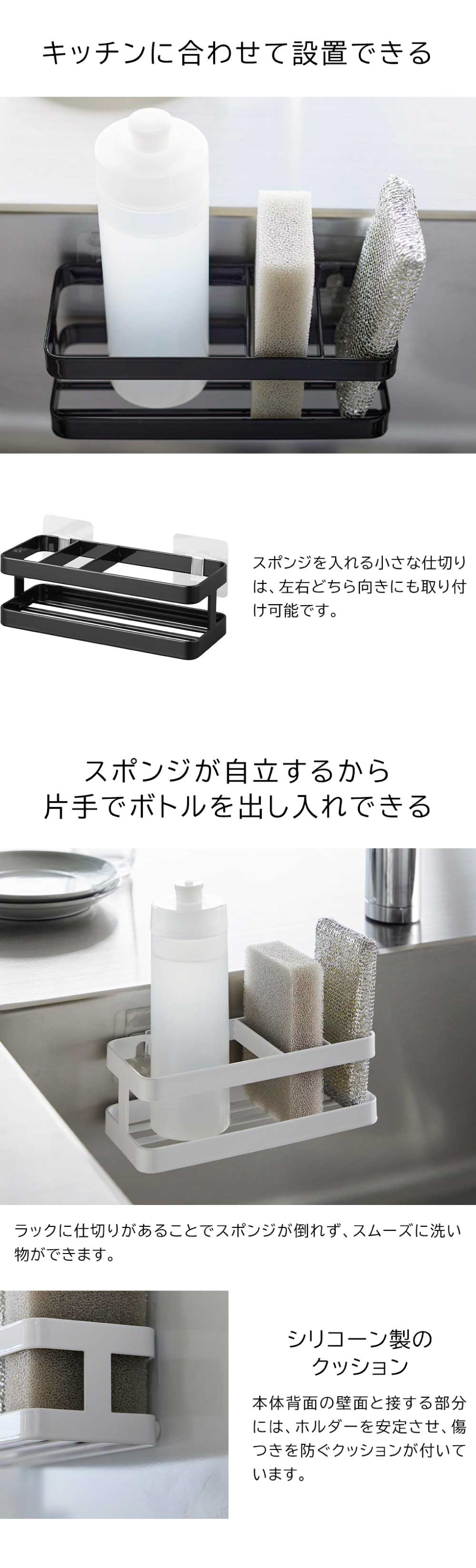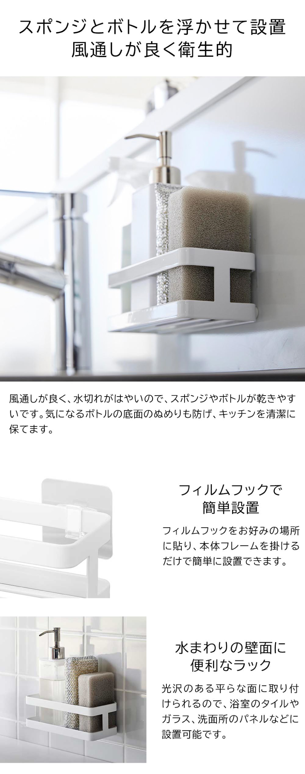フィルムフックで浮かせて設置できるスポンジ&ボトルラックです。よく使うスポンジ2個と洗剤やスプレーなどのボトルをまとめて収納可能。スポンジ部分には仕切りがあるので、倒れることがありません。底面にはスリットが入っており、浮かせているので乾きも早く衛生的に保てます。
