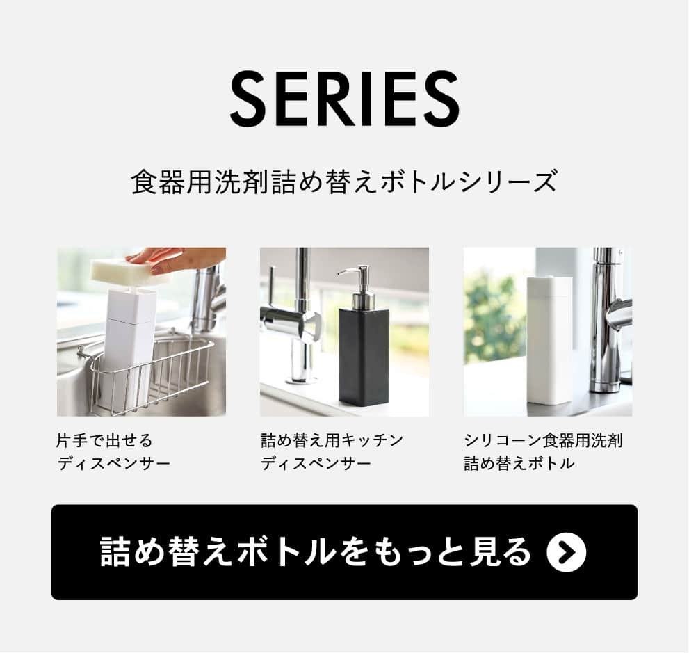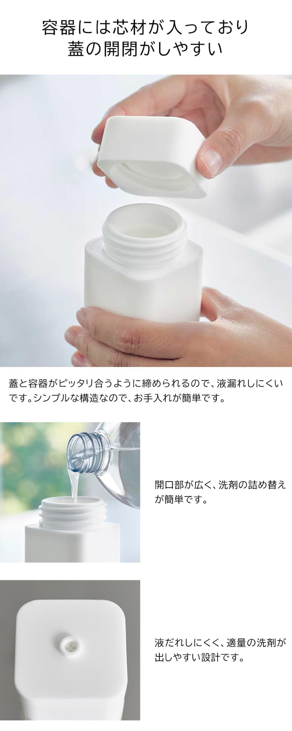 容器には芯材が入っており、蓋の開閉がしやすく液漏れしにい構造。開口部が広く、洗剤250mlの詰め替えが簡単にできるようなっています。食洗機(食器洗い洗浄機)OKなのも嬉しいポイントです。