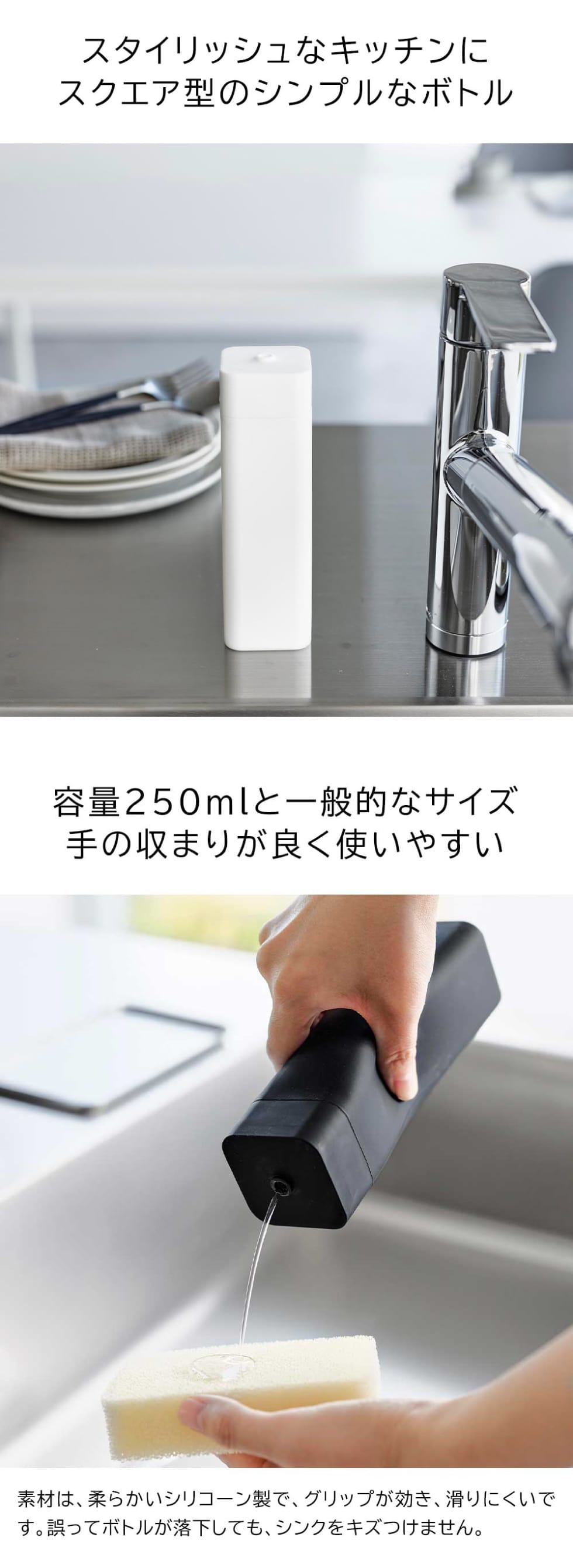 シリコーン製の食器用洗剤詰め替えボトルです。スタイリッシュなスクエア型で、生活感の出やすい洗剤をキッチンになじませてくれます。ボトルの素材は柔らかいシリコーン製で、滑りにくく適量の洗剤が出しやすい仕様。先端部は液だれしにくい設計なので、お手入れが簡単です。
