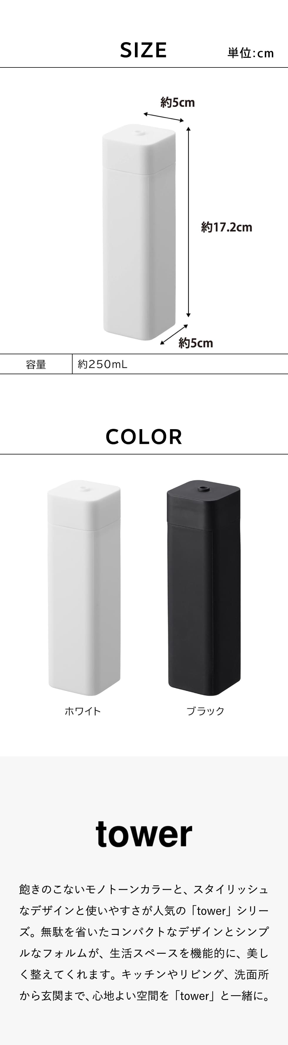 ホワイトとブラックを中心とした飽きのこないモノトーンカラーと、どんなインテリアにもスッと馴染むスタイリッシュなデザイン。そして、とことんシンプルながら、より豊かな暮らしを提案するアイデアがたくさん詰まった、使いやすいアイテムが人気です。無駄を省いたコンパクトなデザインと、シンプルなフォルムが生活スペースを機能的に、美しく整えてくれます。towerのアイテムをライン使いすれば、すっきりとした統一感が生まれ、お洒落でシックな雰囲気を演出します。キッチンやリビング、洗面所から玄関まで揃えたくなるtowerシリーズで、毎日の暮らしを彩る心地よい空間を。