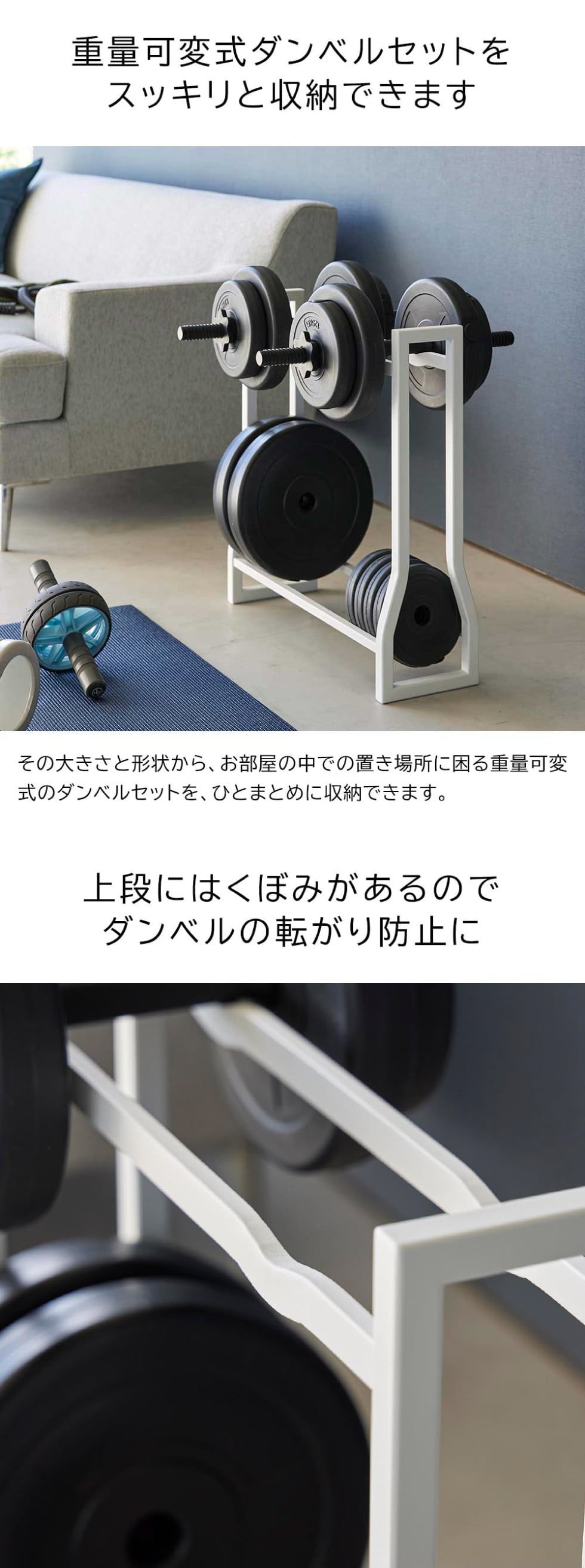 ダンベルやトレーニンググッズをまとめて収納できるラックです。耐荷重は上段40kg、下段50kgと充分。上段2箇所には凹みがあり、ダンベルが転がらない設計になっています。下段には様々なサイズの重量可変プレートを収納できます。