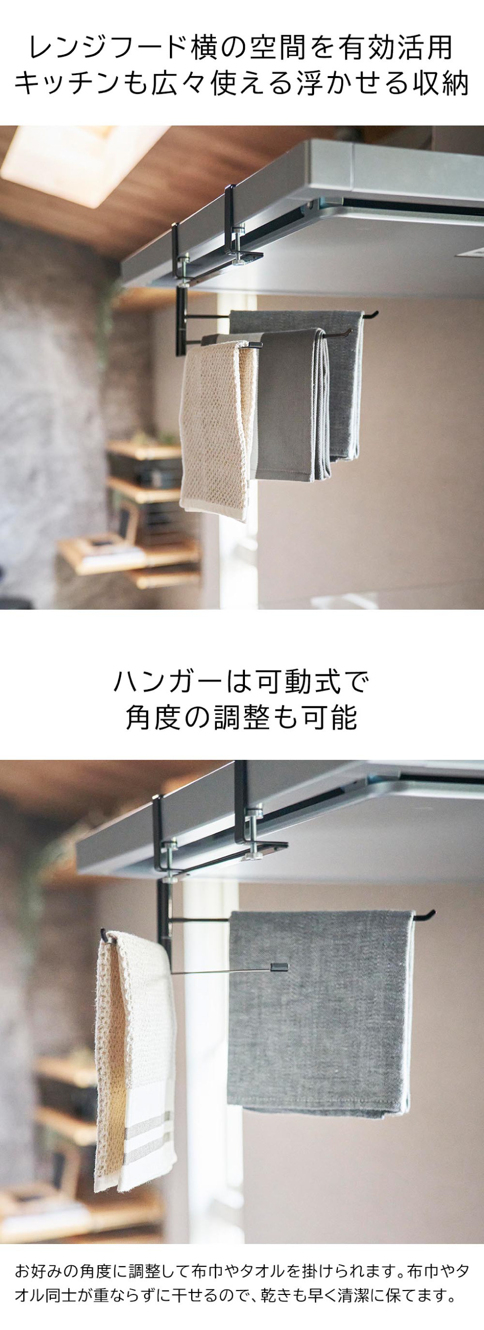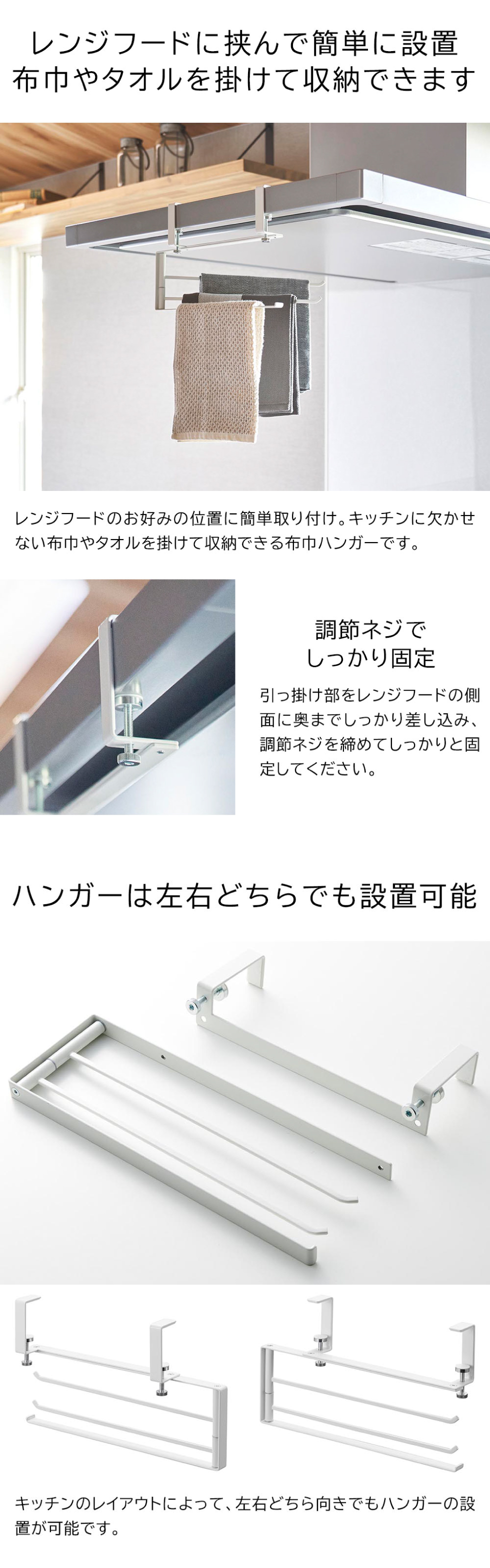よく使う布巾やタオルをレンジフード横に引っ掛け収納できるハンガー3連です。ホルダーの向きは、キッチンのレイアウトや利き手に合わせて左右どちらでも可能。レンジフードに挟み込んで、調節ネジでしっかり固定するので、グラつくことがありません。可動式で広げられるので、乾きやすく使いやすい設計です。