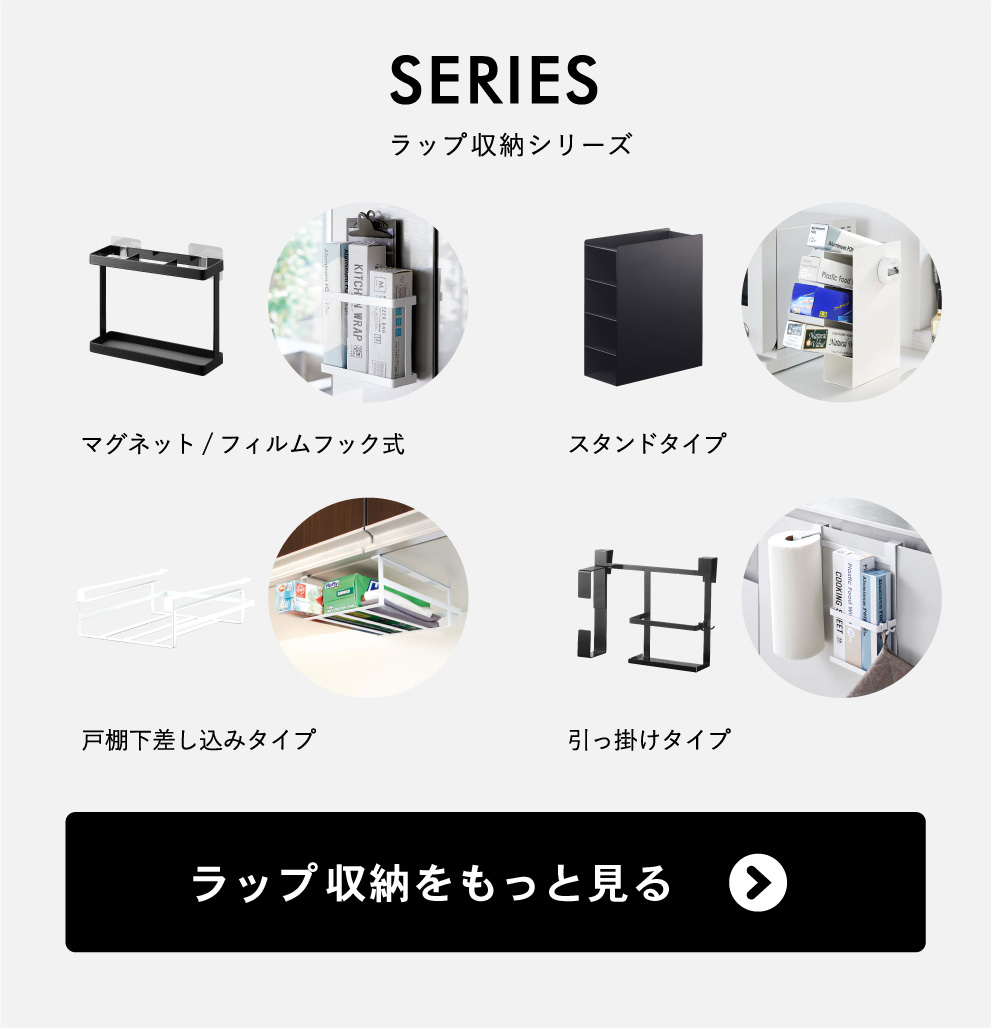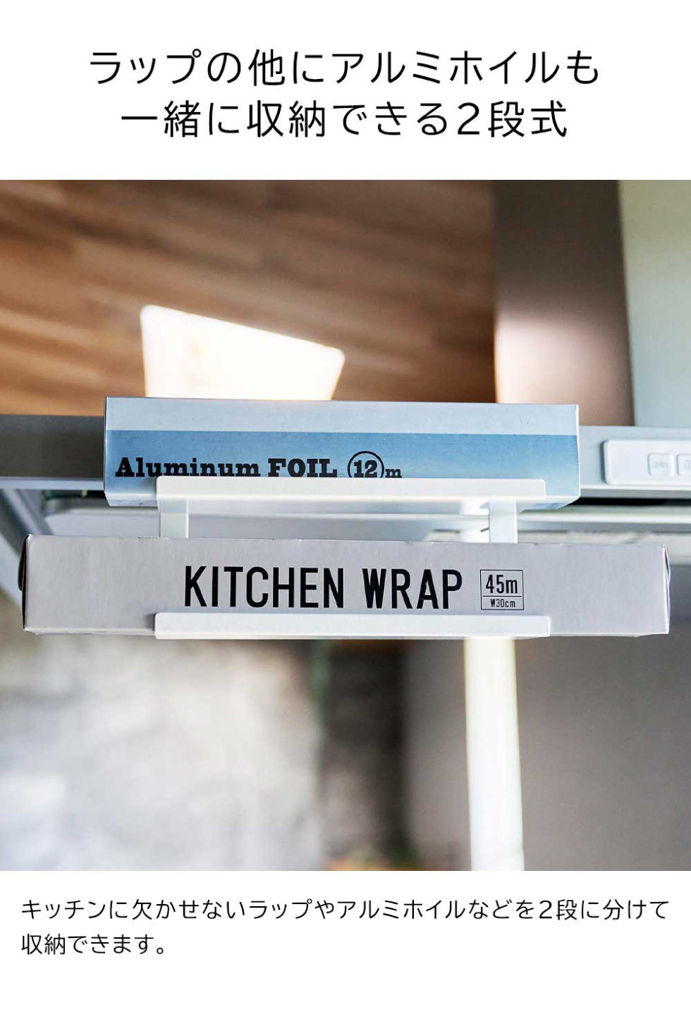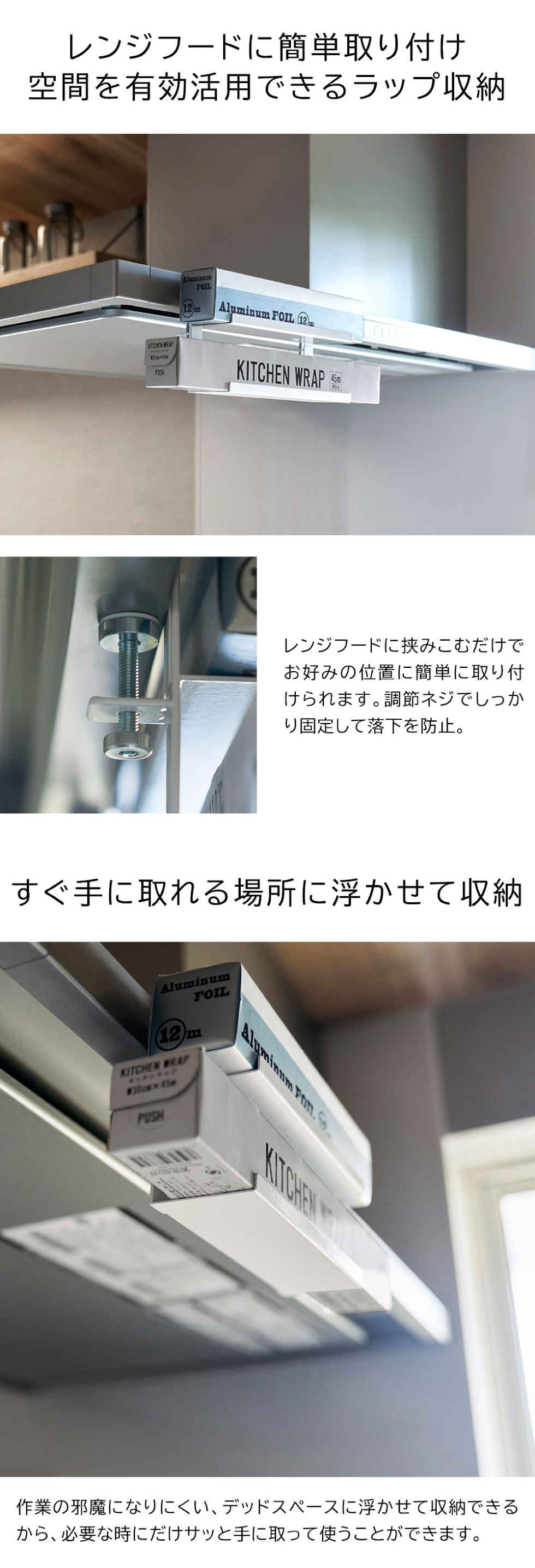 よく使うラップやアルミホイル2個を、レンジフード横に2段に分けて収納できるホルダーです。レンジフードに挟み込んで調節ネジでしっかり固定。内寸は奥行き5.5cm×幅19cmあるので、安定して収納することができます。浮かせて収納しているので使わない時は邪魔にならず、必要な時にはサッと手に取れて便利です。