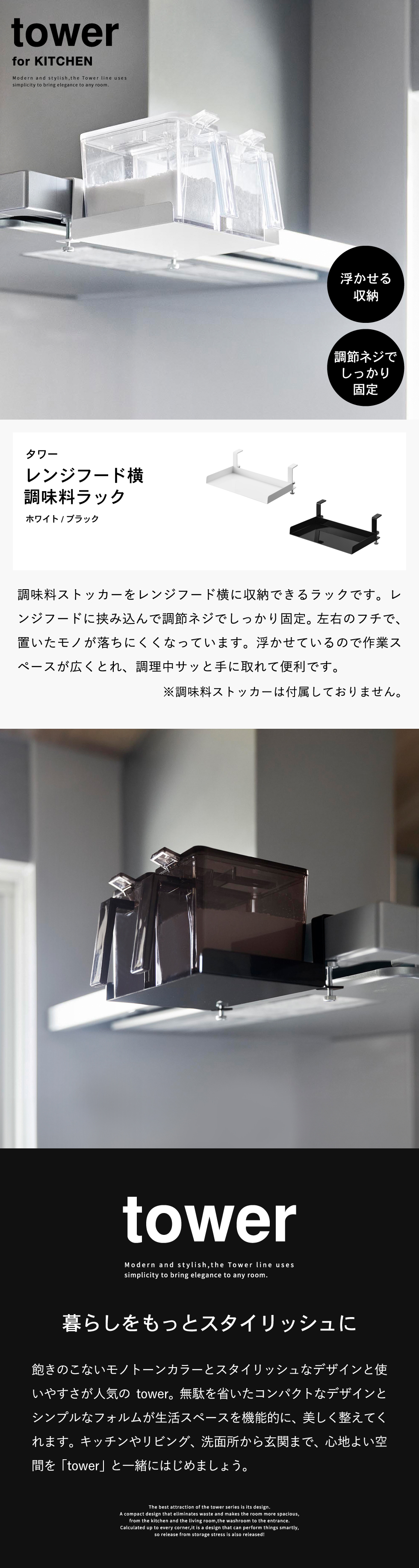 ※こちらは「レンジフード横調味料ラック タワー」の商品ページです。調味料ストッカーは付属しておりません。