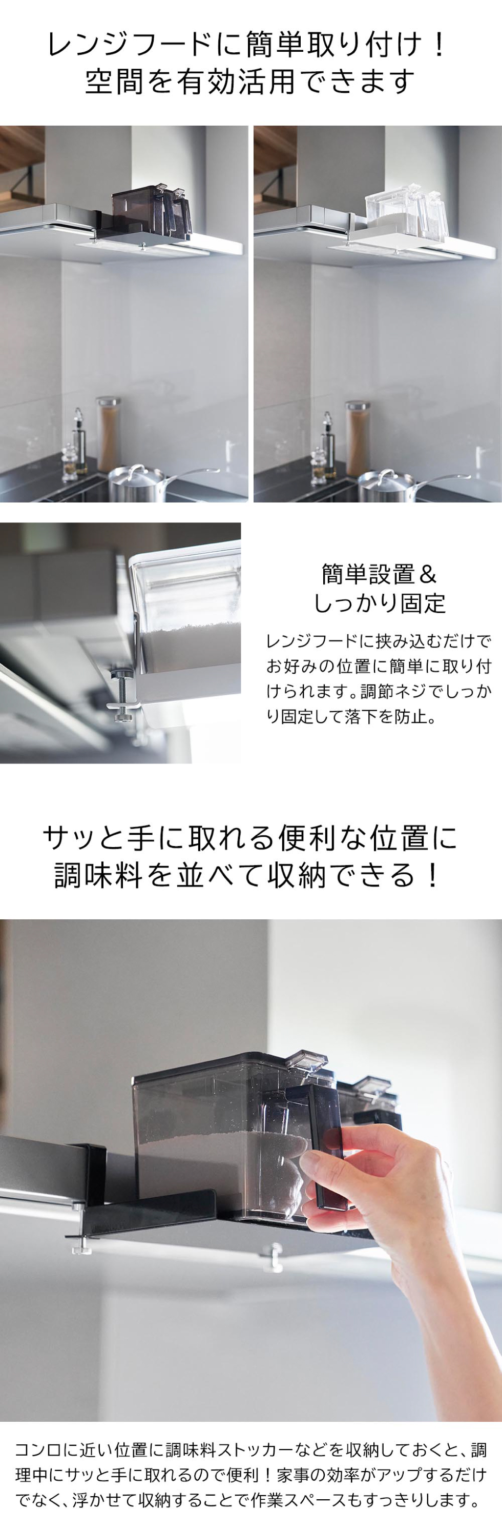 調味料ストッカーをレンジフード横に収納できるラックです。レンジフードに挟み込んで調節ネジでしっかり固定。左右のフチで、置いたモノが落ちにくくなっています。浮かせているので作業スペースが広くとれ、調理中サッと手に取れて便利です。