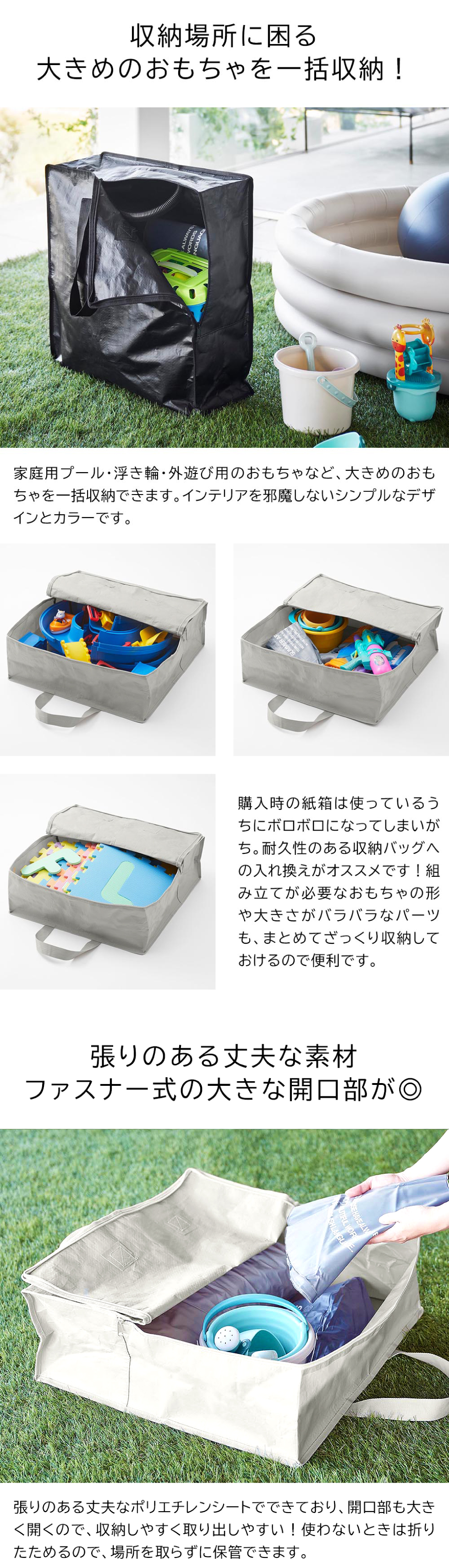 家庭用プールや浮き輪など、外遊び用のおもちゃをまとめて収納できるポリエチレンシートの収納バッグ。マットな質感のポリエチレンシートは、丈夫で長持ち。水に強くお手入れも簡単で、屋内外問わず幅広く使えます。開口部はファスナー式で大きく開くので、収納しやすく取り出しやすい設計です。