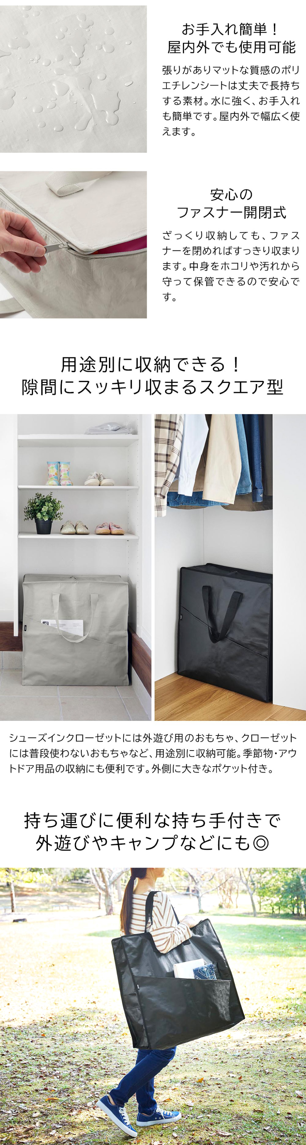おもちゃ以外にも、季節用品やアウトドア用品の収納にもおすすめ。持ち運びしやすい持ち手付きで、外遊びやキャンプなどにも最適です。外側には大きなポケット付きで、レジャーシートなど薄いモノを収納するのに便利です。