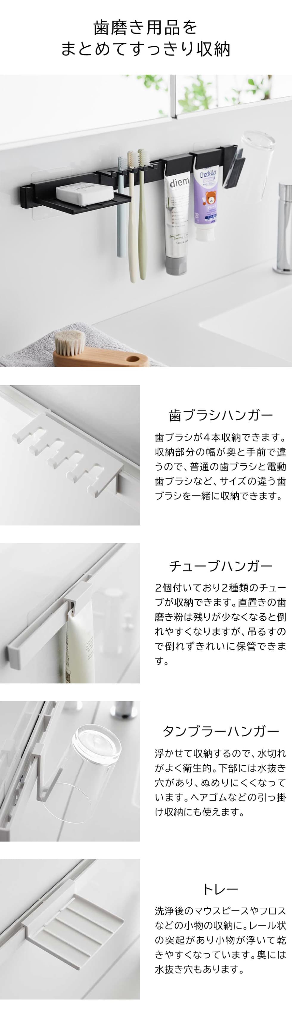 商品サイズ ・本体(各パーツ取り付け時):W38×D9×H6cm(フィルムフック含まず) ・トレー:W9×D8×H2.3cm ・歯ブラシハンガー:W7.7×D3.2×H2.6cm ・チューブハンガー:W4.8×D1.7×H2.3cm(1つあたり) ・タンブラーハンガー:W2×D3.4×H6cm ・フィルムフック接着面:W6×H6cm(1つあたり) |