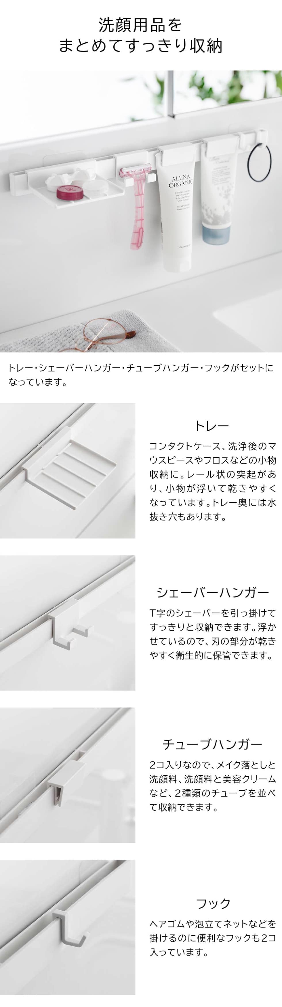 フィルムフックで壁面に取り付けられる、洗顔用品をまとめて収納できるセットです。洗顔チューブを挟むクリップ、シェーバーハンガー、ヘアゴムや泡立てネットを引っ掛けるフック、コンタクトケースなどを置けるトレーが付いています。シェーバーハンガーはT字型のシェーバーをすっきりと収納できる形状。浮かせているので置いた物が乾きやすく衛生的。パーツは取り外して使い勝手のいいお好きな位置に動かせる可動式です。